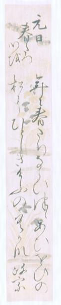 白地に金銀泥で菖蒲等を描き砂子を蒔いた料紙に次の和歌を記す。