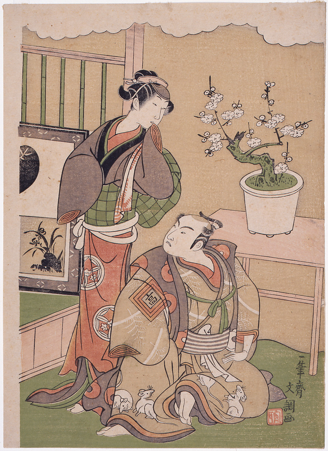 謡曲「鉢木」を当時の人気役者、二代目市川高麗蔵と二代目山下金作が演じる場面を描く。一筆斎文調は、勝川春章とともに鳥居派が描いていた様式的な役者絵ではなく、個々の役者の特徴を捉えた肖似性のある役者似顔絵を描き、その後の役者絵に影響を与えた絵師。(20180130_h102)