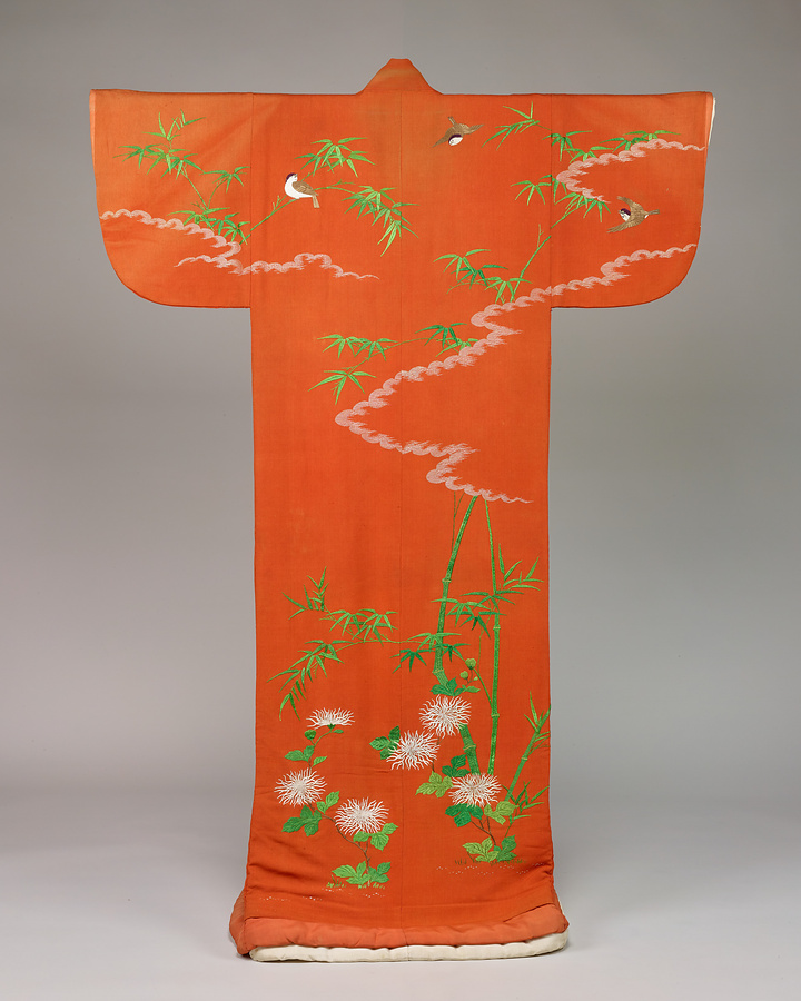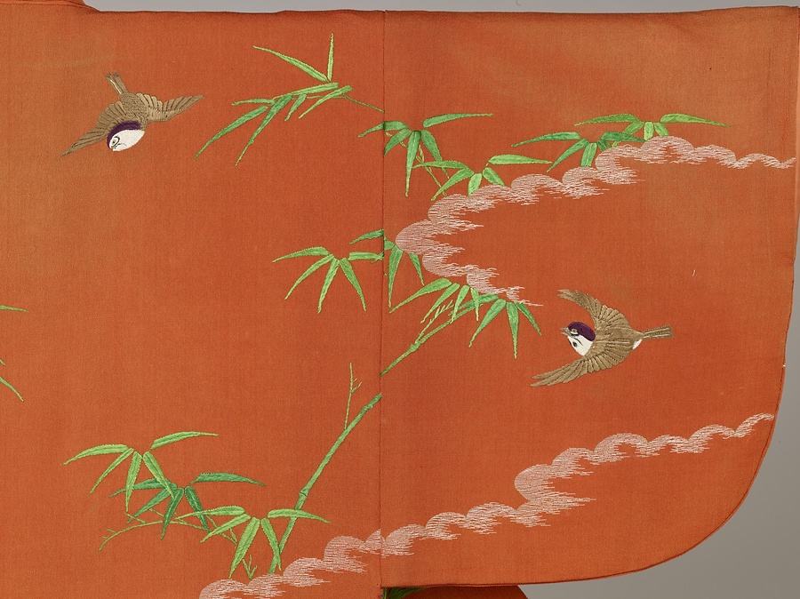 縮緬を高価な紅で染め、伝統的な竹に雀を組み合わせた模様と、白菊を雅やかに刺繡した小袖です。肩に源氏雲をたなびかせ、花鳥模様を刺繡したデザインは、宮廷の女性が着用した小袖の様式です。特徴ある糸菊の模様も、江戸時代後期、公家女性の小袖に好まれました。