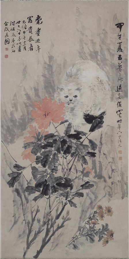 朱偁【しゅしょう】は初名を琛、号を覚未といい、浙江省嘉興の人。倪田【げいでん】は初名を宝田,字を墨耕といい、江蘇省揚州の人、はじめ王素に人物を学び、のち任頤【じんい】の画法をとったという。猫は耄、蝶は耋に発音が通じて長寿を意味し、富貴を象徴する牡丹とともによく描かれる。(110921h_21)