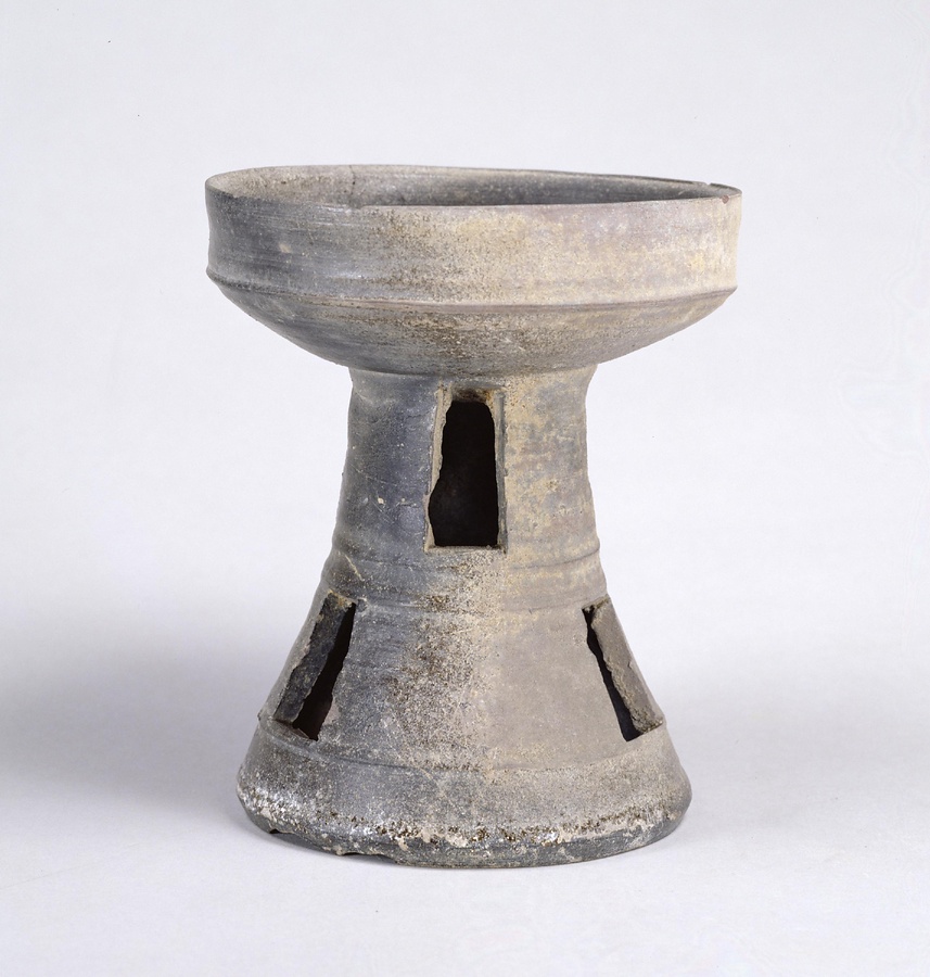 慶(キョン)尚(サン)北道北部の義(ウィ)城(ソン)を中心とした「召(しょう)文(ぶん)」の地域に5世紀にみられる高杯です。新羅の土器の一種ですが、全体に厚ぼったい表現は、5世紀ごろの地方の新羅土器の姿を示しています。