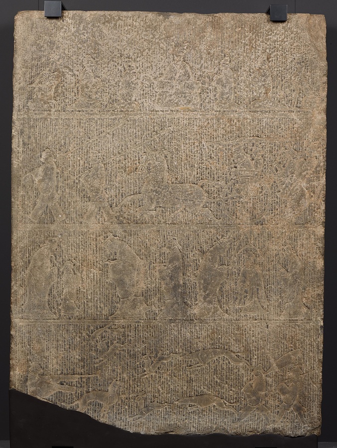 <最下段>狩猟の場面。精悍な猟犬がウサギを追っている。漢時代の支配層は狩猟を好み、画像石にも狩猟の場面がしばしば登場する。