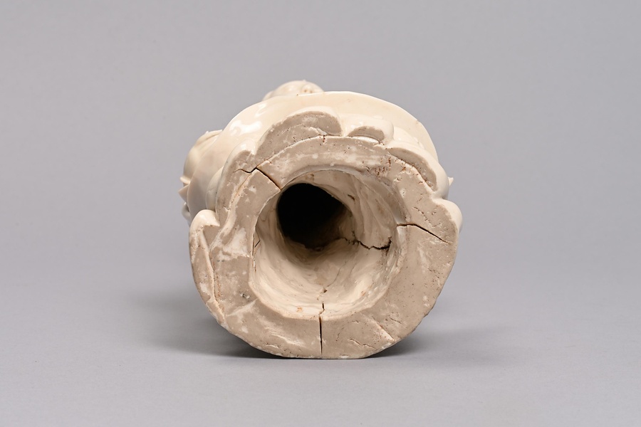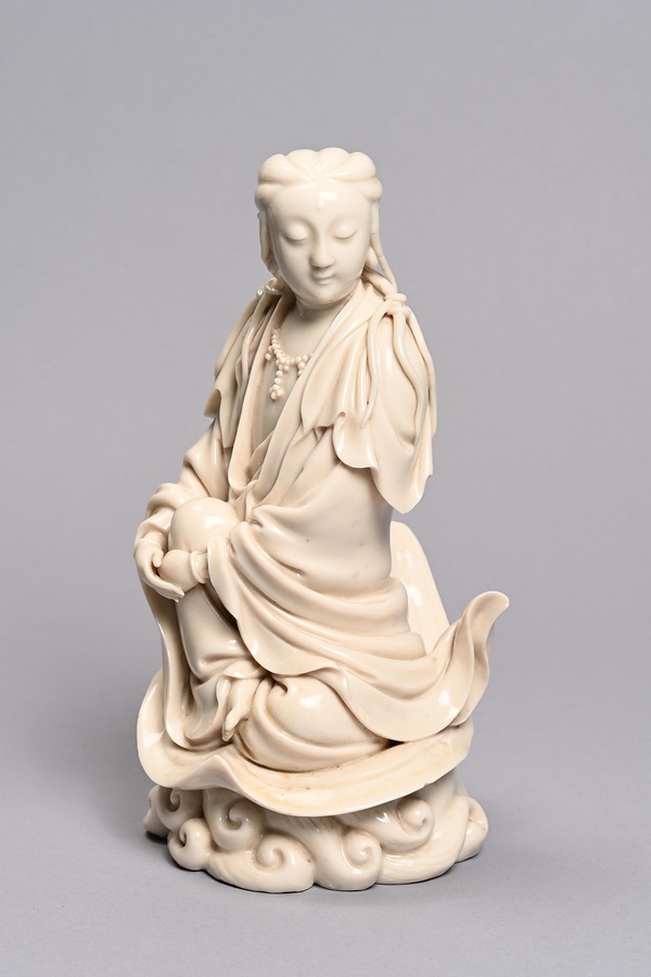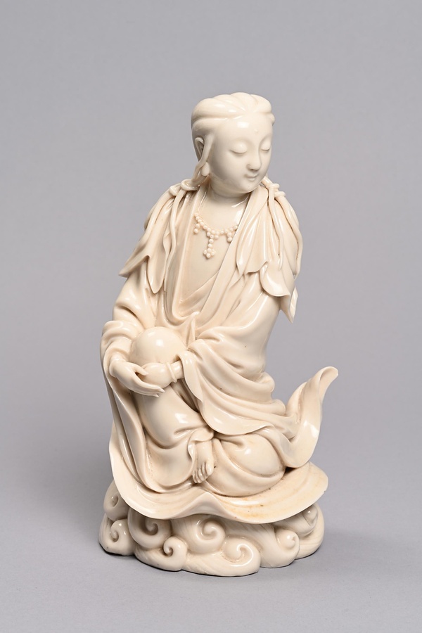 古く宋時代より白磁生産で知られた福建省泉州に位置する徳化窯。明時代には象牙にも喩えられるような乳白色の優品を生産しました。本作品のような観音像は、キリスト教が禁じられた江戸時代の日本に「聖母マリア像」としてもたらされ、珍重された可能性が指摘されています。