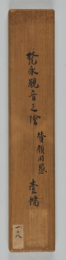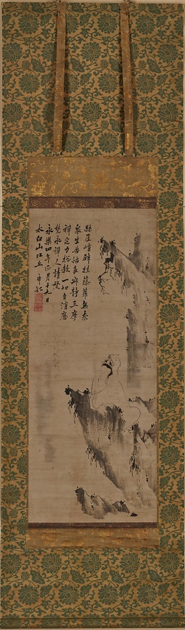 用愚希顔(ようぐきがん)は江蘇長洲の人で、天童山に住した禅僧です。観音の容貌は細線でとり、闊達な山水描写のなかに、ゆったりとした姿で描かれます。本図と非常によく似た、一曇聖瑞(いちどんしょうずい)賛「白衣観音像」(南北朝時代、東京国立博物館)があります。(130702_t081)(20180828_t08数文字追加)