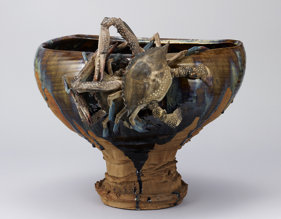 褐釉蟹貼付台付鉢