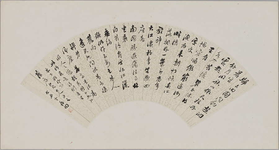 李葆恂(字叔黙(しゅくもく)、号文石(ぶんせき)は詩文書画を善くし、書画の鑑識に精通しました。収蔵家の端方(たんぽう)に重用され、自らも金石拓本を多く収蔵しました。灑金箋@さいきんせん@の扇面を用いたこの書は、明時代に冠絶した華亭(かてい)派の筆意に倣ったことが落款より知られます。潤渇の変化に富んだ字姿です。