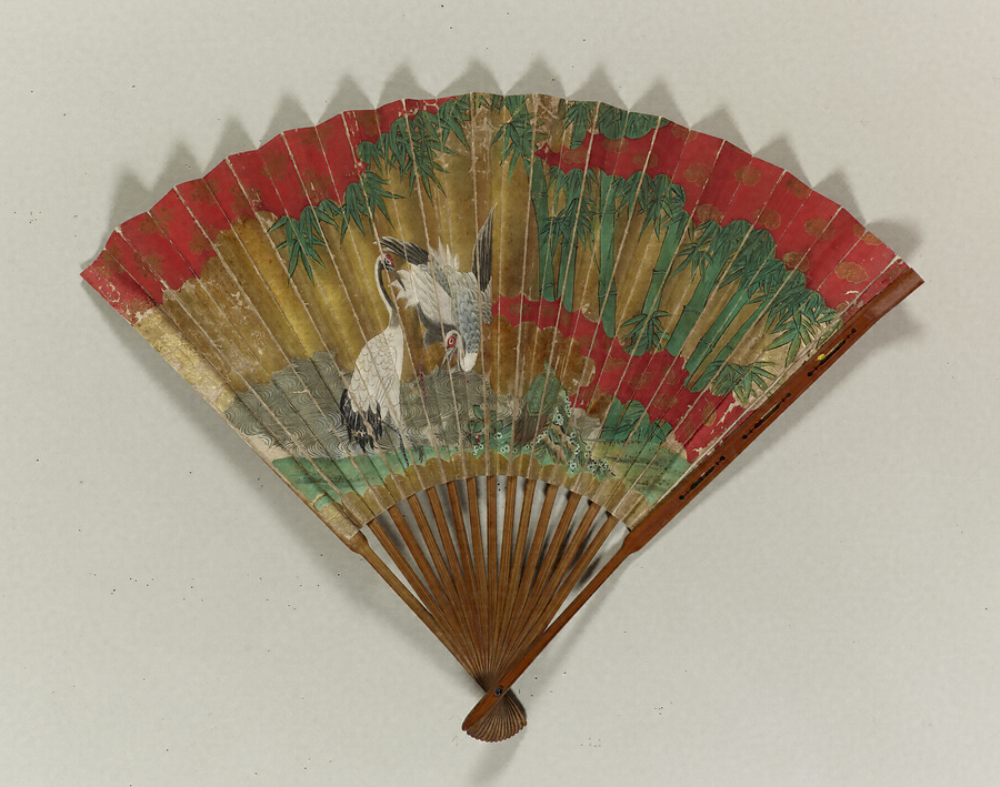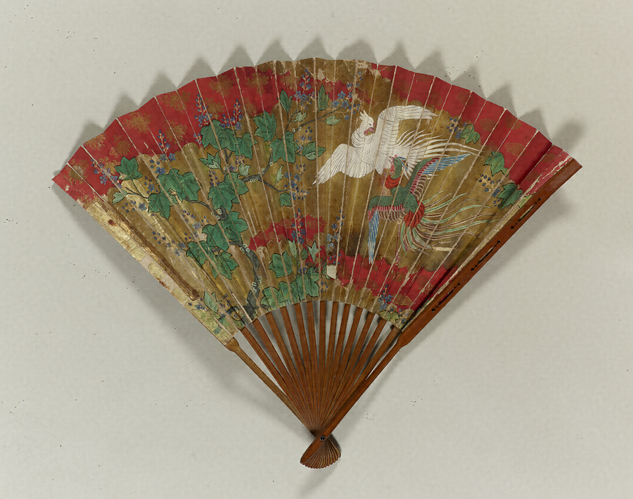 古代より中国王朝の瑞祥(ずいしょう)としてあがめられてきた鳳凰は桐の実を食するという言い伝えから、組み合わせてデザインされる。日本では天皇の象徴とされたが、能においては神々の役に用いられる「神扇」の典型的な模様とされた。神扇は白骨、紅褄(べにづま)という決まり事がある。(20130102_h09)