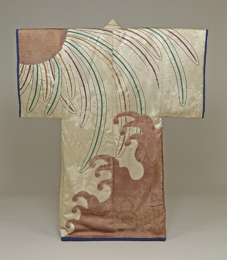 左の袖を中心に菊とみえる大花、対角の右裾@みぎすそ@を起点に波を配する奇抜なデザインは、江戸時代前期、寛文@かんぶん@年間の特徴です。綸子地に織り出された大振りの源氏車に花の地模様も珍しいものです。男性の衣装か、それとも夜着なのか、と思わせる大振りな衣装です。