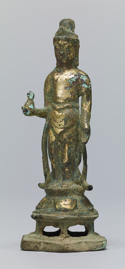 右手に水瓶を執り、左手を緩やかに垂下するバランスの取れた姿です。小像ながらも洗練されたスタイルで、新羅の都がおかれた慶州から出土したとの言い伝えも納得できます。台座を含めて一度に鋳造していますが、背面を省略する手法はこの時期の金銅仏に多く見られます。