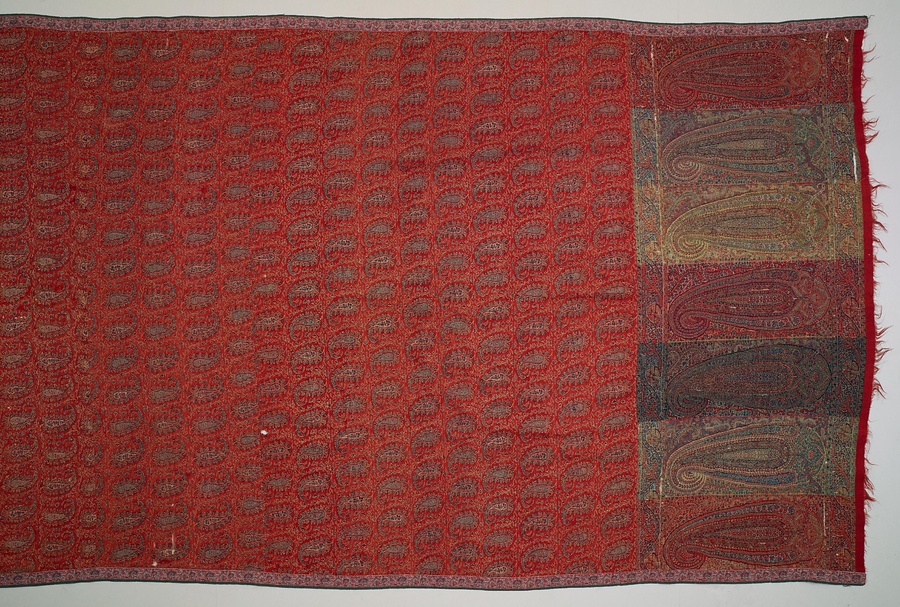 両端に大型のペイズリーを置くデザインは、19世紀前半にインド北部を治めたシク王国時代の特徴です。文様をパーツごとに織り、はぎあわせることで一枚のショールに仕立てています。ペイズリーは花卉【かき】文様から次第に雫形になり、19世紀には先端がフック状へと変化しました。