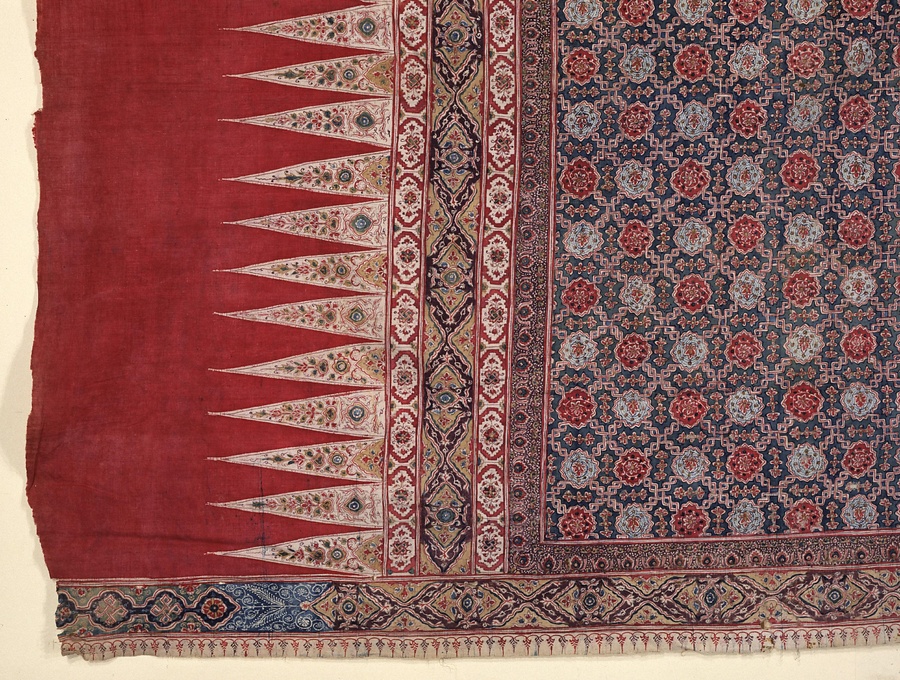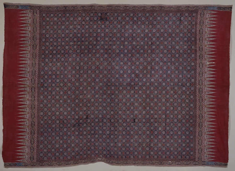 両端に縁どられたギザギザの鋸歯文様は、インドネシアで使用される巻きスカートや儀式用の布に特徴的な文様です。インドネシアからの注文を受けて、インドネシア向けにデザインし、染めたものです。やや粗雑ではありますが、すべて手描による文様です。