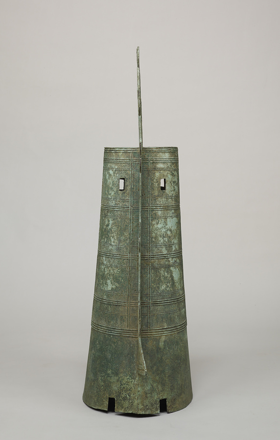 本例は銅鐸の中でも最も新しい突線紐式銅鐸です。紐(ちゅう)には双頭渦紋飾耳(そうとうかもんかざりみみ)がつけられ、鰭(ひれ)から続く鋸歯文が配されます。また、鐸身は縦横に区画され、斜格子紋が充填されています。音を鳴らすという本来の機能を失い、より大きく装飾性豊かに作られた銅鐸です。