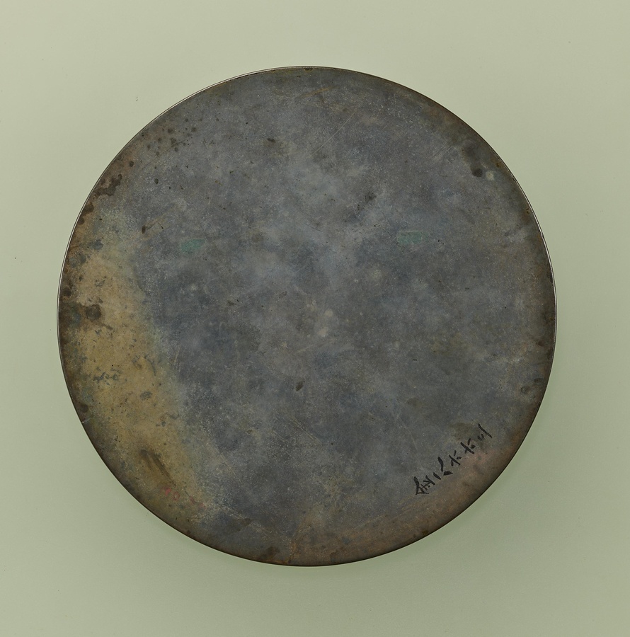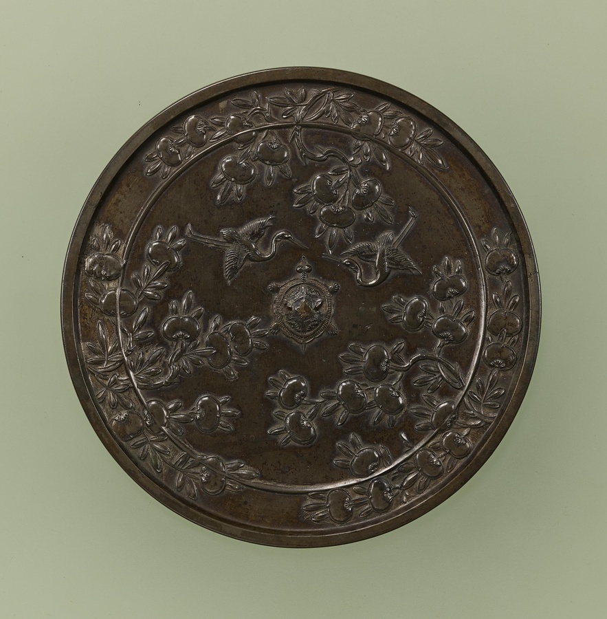 背面に装飾を施す円鏡です。中央に亀形の鈕【ちゅう】を置き、これに2羽の鶴が嘴【くちばし】を合わせようとするのは鎌倉時代末から室町時代にかけて流行する意匠です。周囲には実をつけた橘【たちばな】が表されています。橘は常世【とこよ】の国からもたらされたとの伝承があり、鶴亀とともに吉祥文様【きっしょうもんよう】を構成しています。