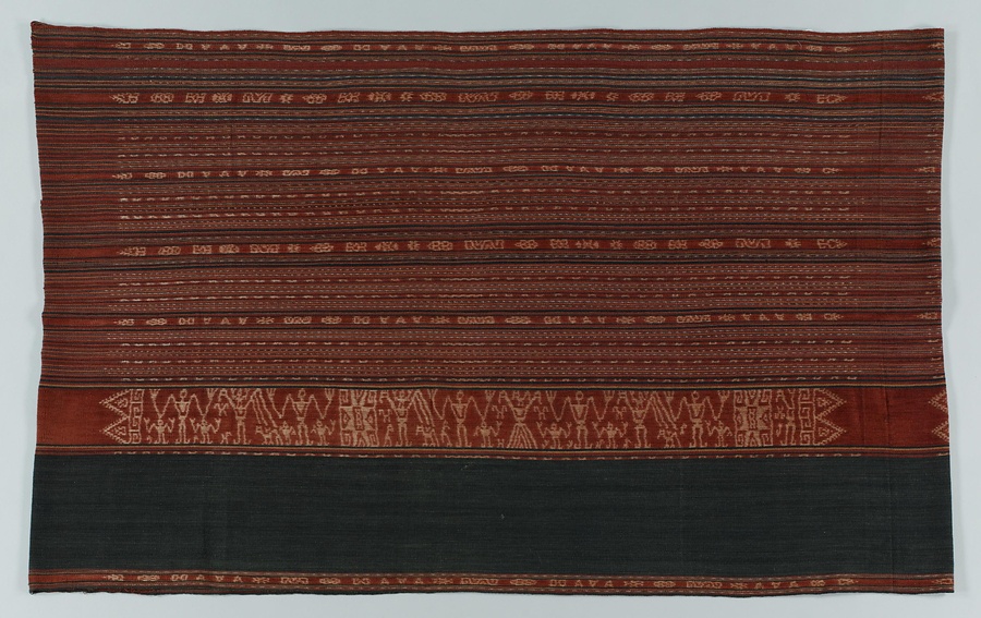 点描のような経絣と細い経縞を中心に、動物と人像模様をあらわす。一般的に人像模様は、死者や先祖などをあらわしているといわれている。この経絣は、経糸が輪状に整経(せいけい)されているため、一部が経糸のままの状態で遺されている。着用の際には左右が上下となる。