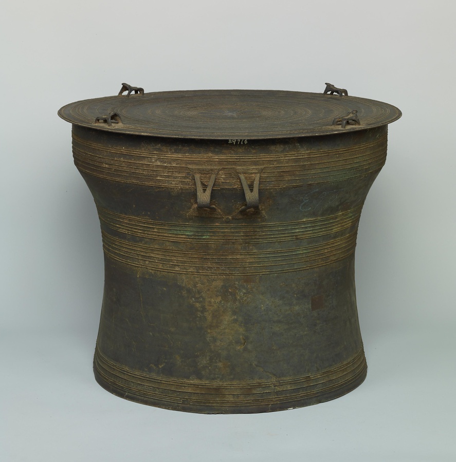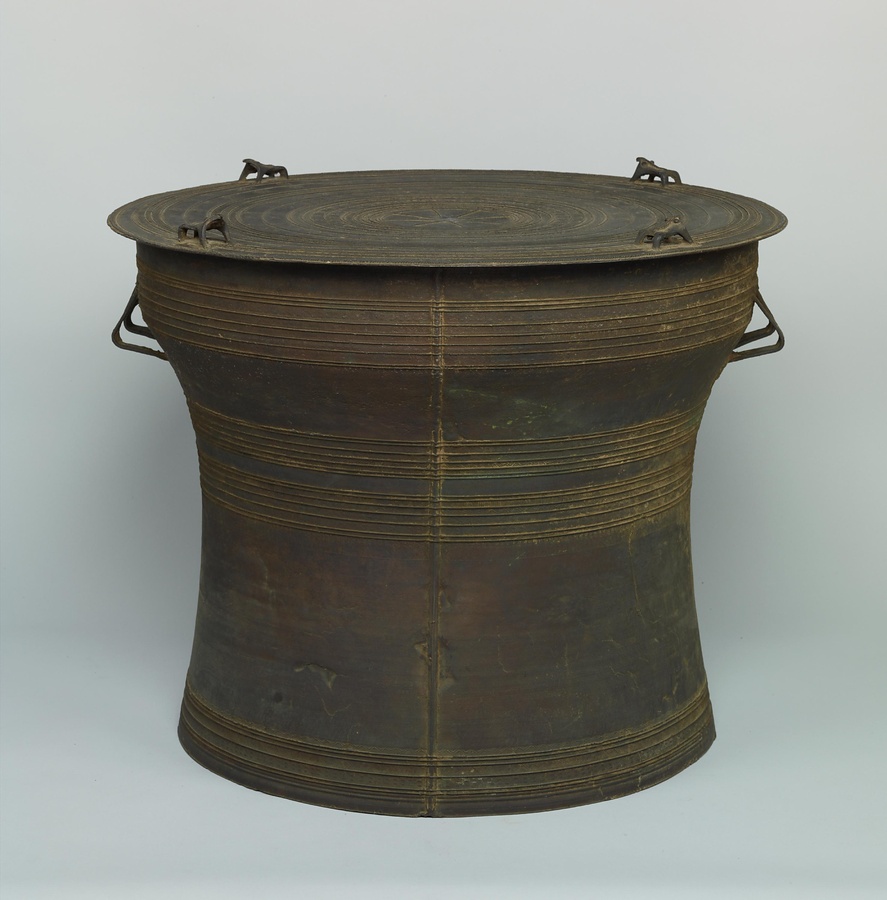 鼓面には光芒文{こうぼうもん}の周囲に鳥文、魚文、蛙形の装飾などを巡らせています。寄贈者のダムロン親王はタイ国王ラーマ5世の弟で、同国近代化に努めた人物です。明治34年(1901)寄贈の本作は近代における日本とタイとの交流史を物語る貴重な資料でもあります。