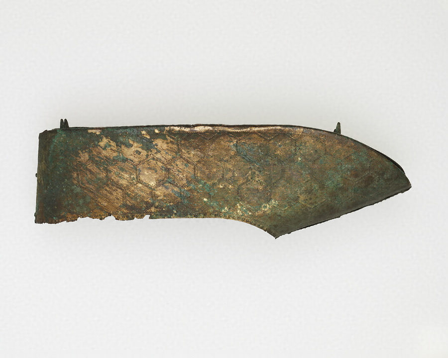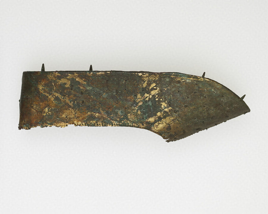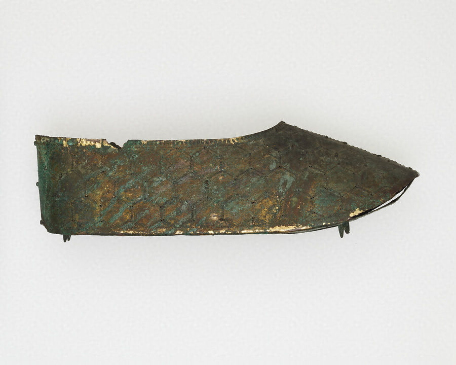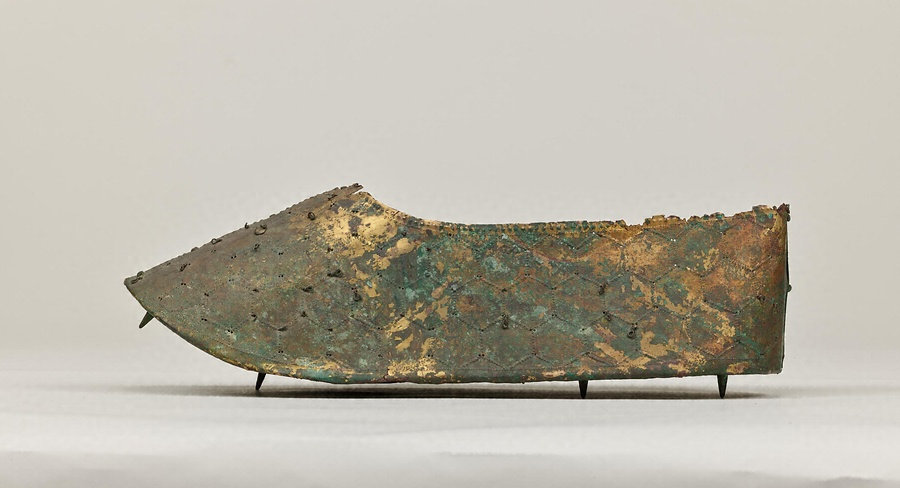 熊本県の江田船山古墳から出土した沓(くつ)です。江田船山古墳は菊池川中流域に位置する前方後円墳です。5世紀後半から6世紀初めに造られたと考えられています。明治6年(1873)に、刀剣や、甲冑(かっちゅう)などの武器・武具類、金銅製の冠帽や沓、耳飾りや玉などの装身具、6面の銅鏡、馬具、須恵器など、豪華な副葬品がたくさん出土しました。現在それらは一括して国宝に指定されています。