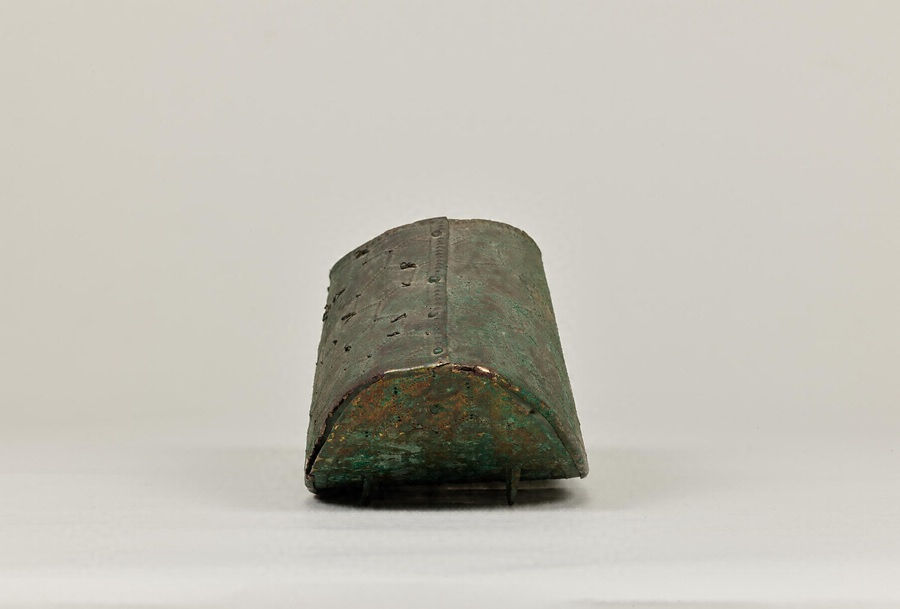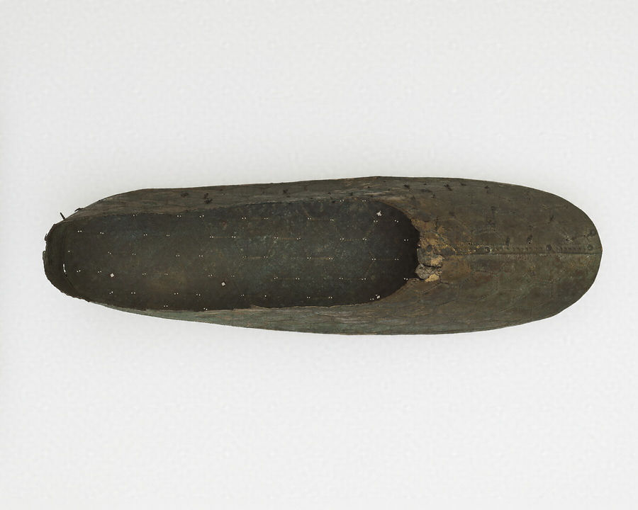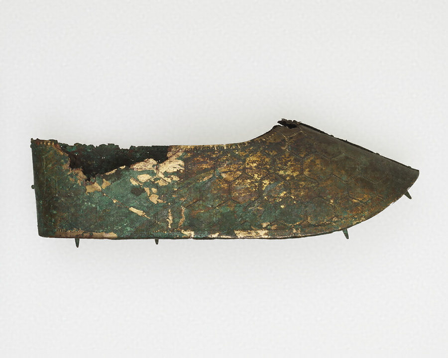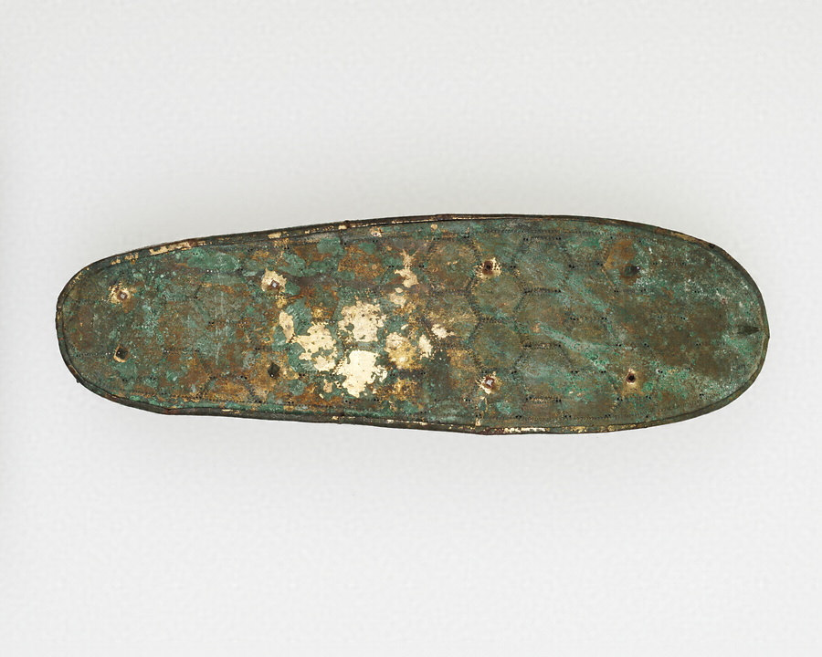 ここでご紹介する沓は、底の1枚と側面の2枚、全部で3枚の薄い銅板をつなぎ合わせて作ったものです。側面の2枚を正面で合わせ鋲で留めています。この銅の上から全体に金メッキを施しており、今でも、一部に金色が残っています。表面には亀甲紋という、亀の甲羅の六角形を連続させたような模様が配置されています。一部、それぞれの六角形の角の部分に穴があいているのは、そこに歩揺(ほよう)と呼ばれる小さな丸い鱗のような飾りがついていたからです。少し見えづらいのですが、靴底も亀甲紋で覆われていて、スパイクのような突起が左右9個ずつついています。