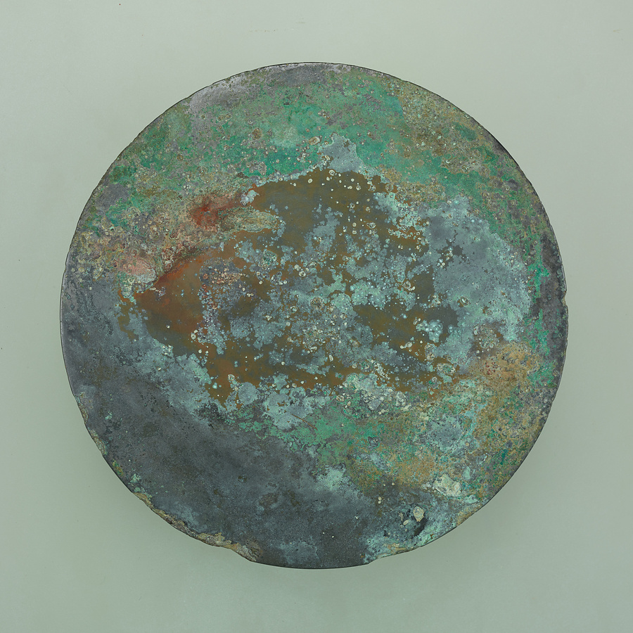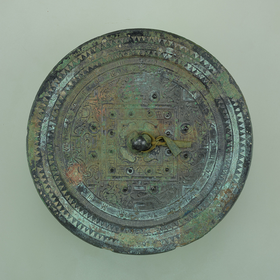 方格規矩四神鏡は、四神像と方格とT・L・V字形の規矩文で古代中国の宇宙観を表現した鏡です。方格内に十二支銘を配し、内区には鳥や獣も表現します。なお、方格と規矩文の配置は、古代中国で占いにも用いられた盤上遊戯、六博の盤面と共通します。ルビ:きくもん、じゅうにしめい、けもの、ばんじょうゆうぎ、りくはく、ばんめん