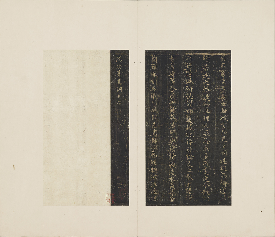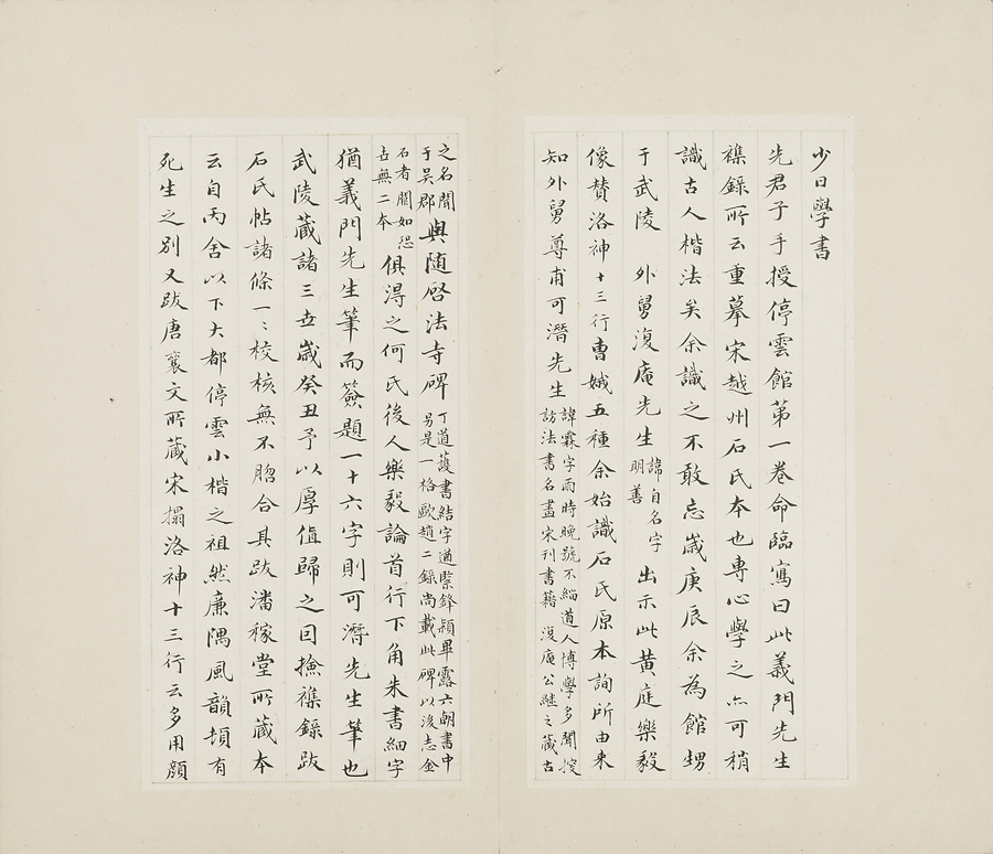 この冊子には、王羲之(おうぎし)や虞世南(ぐせいなん)など、東晋(とうしん)時代4世紀と唐時代7世紀から8世紀の、書の名家の作として伝わる「小楷」(しょうかい)、つまり小さなサイズの楷書体の拓本が、合計11種類収められています。「拓本」は、もととなる書跡を石や木に転写して彫り込み、紙に摺ったもので、白黒が反転しています。これらの拓本は、南宋時代12世紀に石邦哲(せきほうてつ)という人物が編集した『博古堂帖』(はっこどうじょう)という法帖(ほうじょう)に収録されたものの一部です。「法帖」とは、名筆といわれる書跡を集め、冊子の形式に仕立てたものです。
