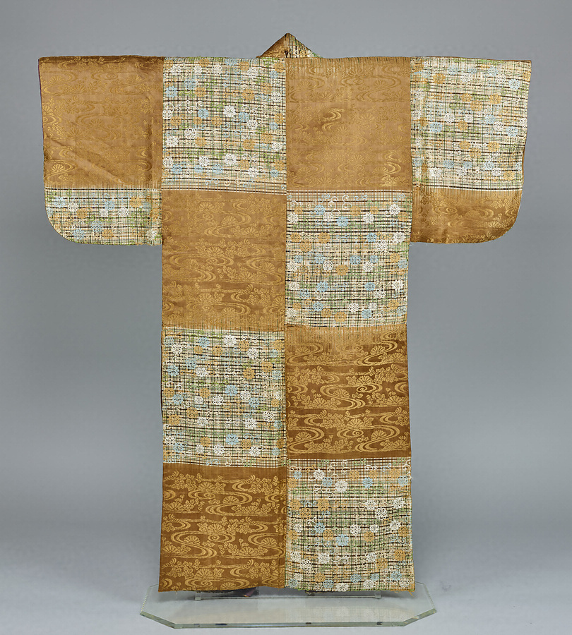 厚板とは、もともと厚い板に巻かれて輸入された錦(にしき)のことを言ったが、江戸時代以降は、能装束の名称となった。男性役の着付に用いられる。白と茶に染め分けられた経糸(たていと)に、菊水模様と、唐花に格子模様を交互に織り出した厚板。高貴な役柄にふさわしいデザイン。20091110_h09