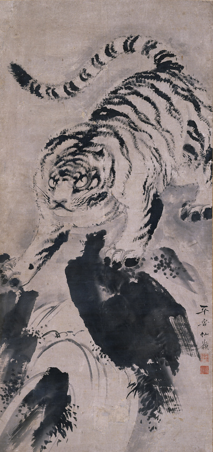 「仙嶺(せんれい)」の画号は、応挙と名乗る前の明和2,3年(1765、66)ころに使われていたと推定されている。応挙時代の洗練された虎とは異なるが、荒い筆の動きで虎の迫力と動きをとらえている。短い筆線を重ねることで毛の柔らかさも表現されている。