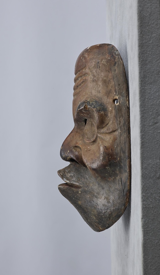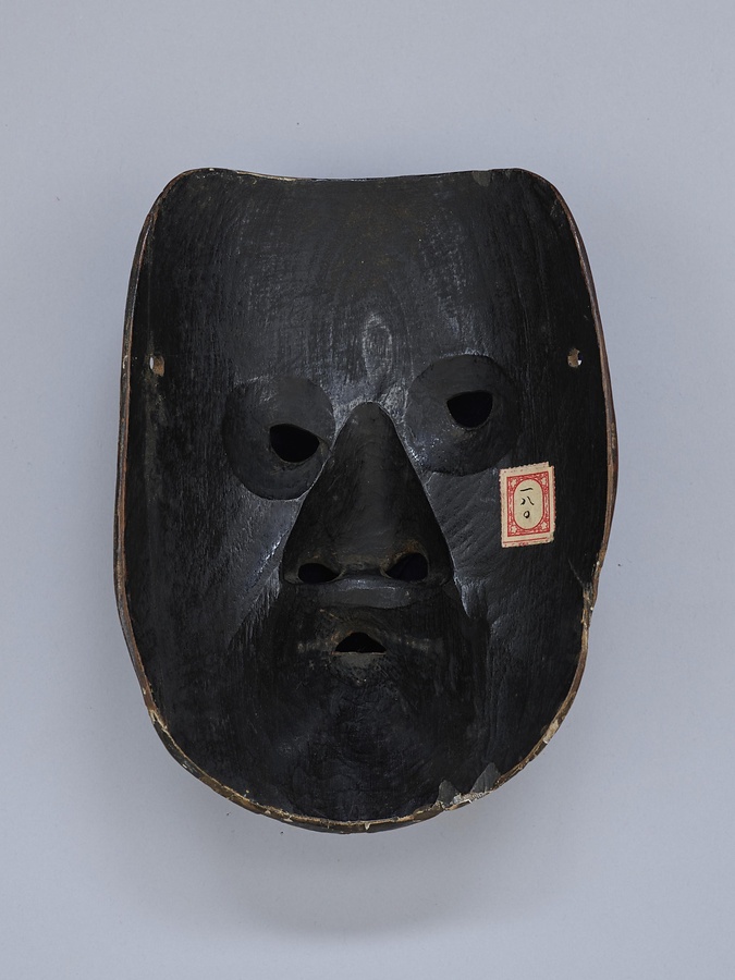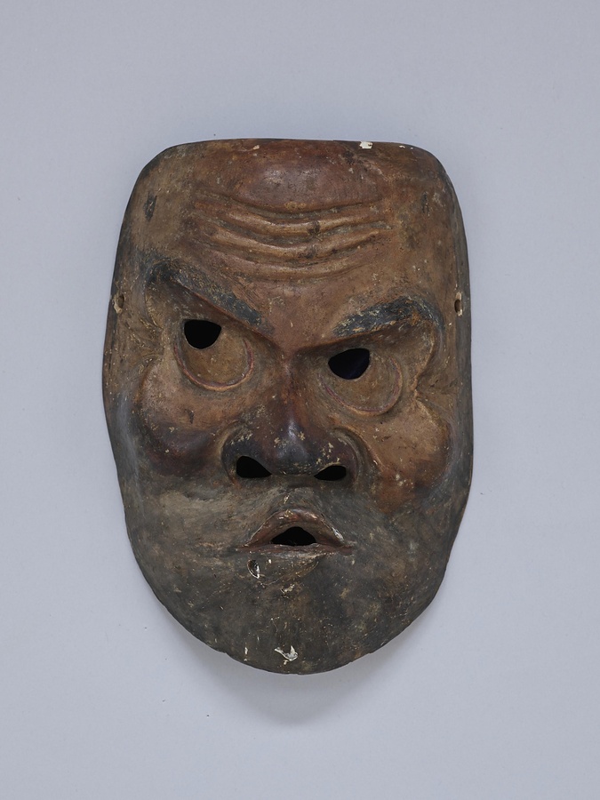 口をとがらせ、ぎょろりとした眼を左右非対称に開かせたユーモアのある表情です。蚊の精、蛸の精、罪人、案山子など幅広い役柄に用います。眉やひげに毛を植え、老いた表情を表わします。口をすぼめるのは仮面の古い形で伎楽面や舞楽面に見られます。