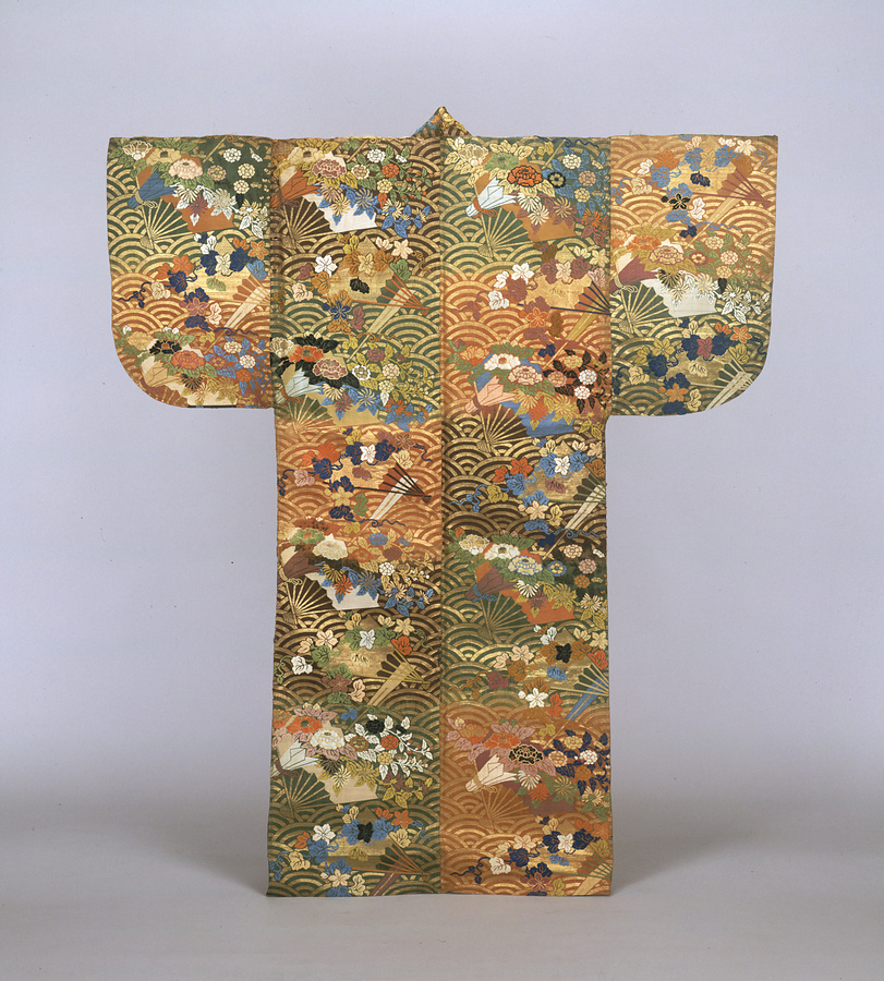 ベースの色として、緑色、紅色、茶色が石畳模様のように段違いになっているところに、青海波模様の地紋を織り入れています。そこにあらわされているさまざまな模様に注目してみましょう。扇の上に、5枚の花びらを持った花を咲かせる蔓草がのっているのが見えるでしょうか。これは夕顔の花。「扇」に「夕顔」というと、「源氏物語」の第4帖、「夕顔」の章で、光源氏が所望した夕顔の花が扇に乗せて届けられるという出会いの場面が思い浮かびます。このように、模様によって特定の物語がイメージされるというのは、日本の模様やデザインの特徴のひとつです。