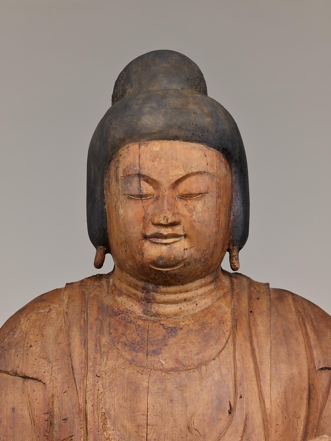 この吉祥天像は、かつて京都・亀岡市の大宮神社(おおみやじんじゃ)に伝来していた像です。主要な部分を一本の木材から彫り出した「一木造」(いちぼくづくり)の像にふさわしく、どっしりとした重量感があり、また実際にもかなりの重量があります。両肩はがっちりと張り、胸板は厚く、頭や顔は丸々としています。着衣の袖の線に注目してください。鑿(のみ)が荒々しい線を刻み出しています。重量感と力強さに満ちた技法や表現に、10世紀の木彫の特色がよく表れているといえるでしょう。