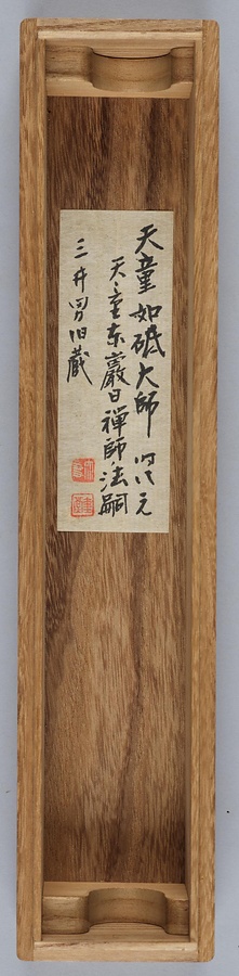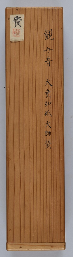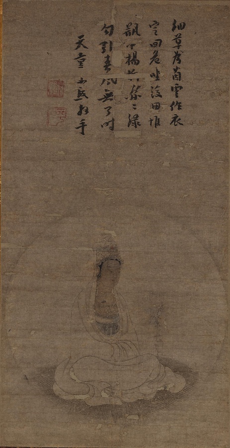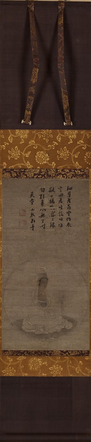 宝冠の一部と唇に僅かに朱を点じ、他は緊張感のある墨線のみで観音菩薩を描く白描という画法の名品です。平石如砥【へいせきにょし】は、寧波【ニンポー】の保聖寺・天童寺などに住した禅の高僧で、日本人の弟子もいました。本図は寧波の禅林での日中交流によって伝えられたと推定されます。