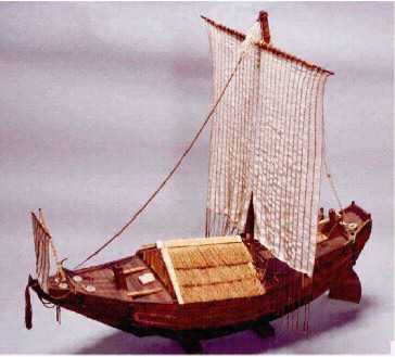 「和船:天昭丸」神戸高等商船学校時代からの数少ない模型の一つであって、模型内部に昭和5年10月大阪:天野造船所天野三吉作と記されている。この模型が寄贈された経緯についての記録はないが、昭和11年の新聞紙上に模型紹介記事が載せられているから、製作されて間もなく寄贈されたものであると思われる。模型と共に和船に関する寸法書も寄贈されたとのことであるが、図書館の全焼によって失われたものか、残念ながら現存しない。天野三吉氏は大阪の造船所主であって、若い頃北前船の建造に従事し、老年になってから記念のため模型を作成寄贈したという。この模型とほとんど同型の模型が、旧船主右近家にも伝えられ、現在は同家から神戸海洋博物館に寄贈されているが、同じく天野三吉昭和7年7月製作となっており、また横浜国立大学にも一隻所蔵されている。本模型は全長1.06メートルの小型のものであるが、精巧を極め、使用材料は実際の和船と同様の材質を選び、構造等は細部に至るまで省略することなく、細かく彫刻をほどこし、船内偽装品も完備した逸品である。 製作には5年の日時を要したいわれるのももっともであろう。船型もアカマ梁で最も幅が広く、儀装も明治中期の北前船末期の特徴をよく示し、各部寸法の比率も正確であって、北前船の標準的な模型ということができる。