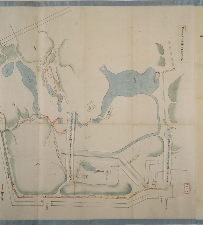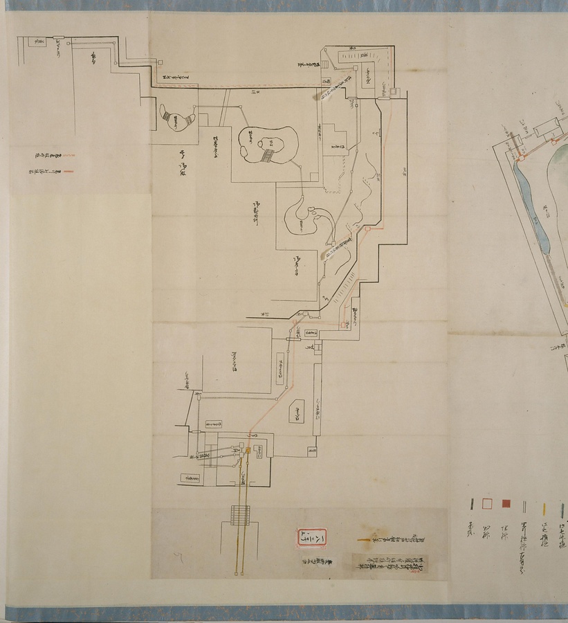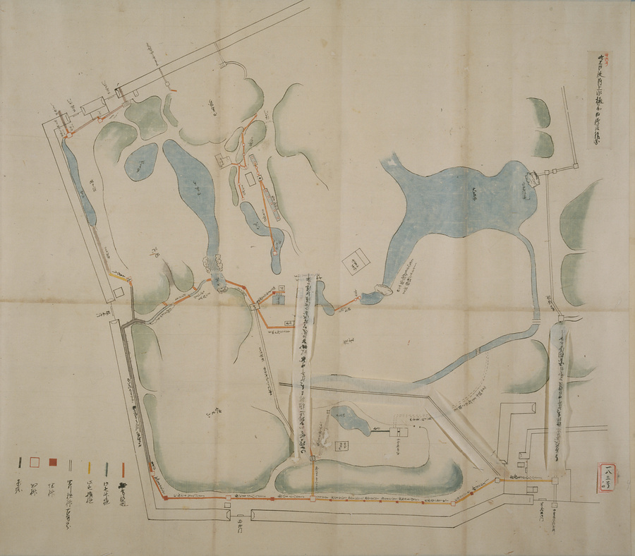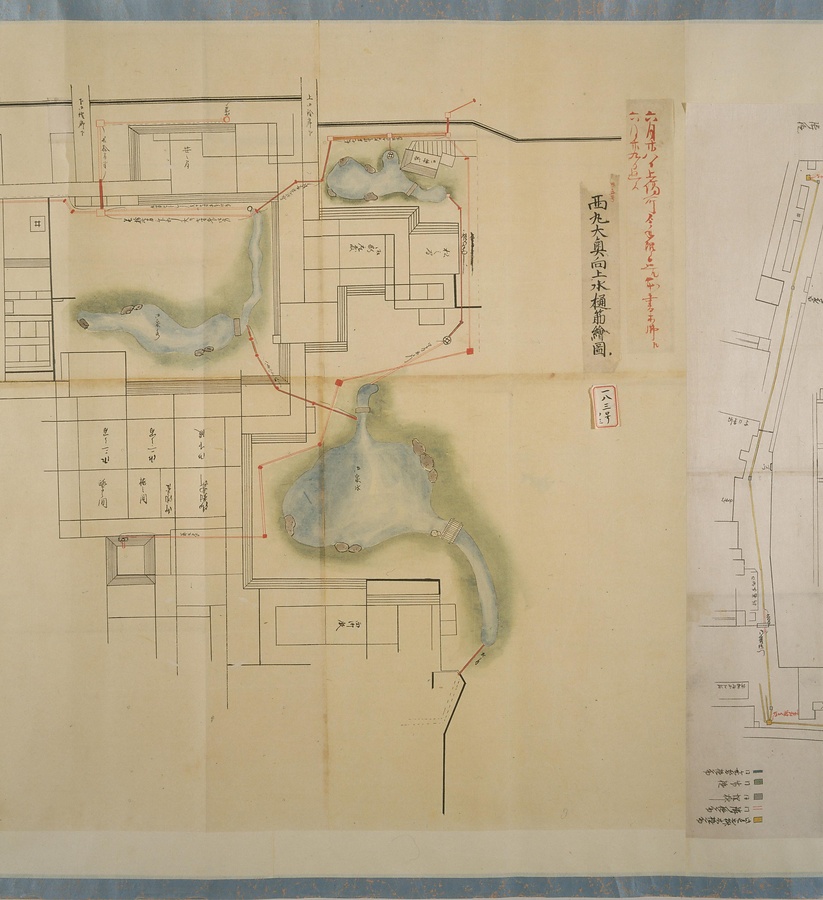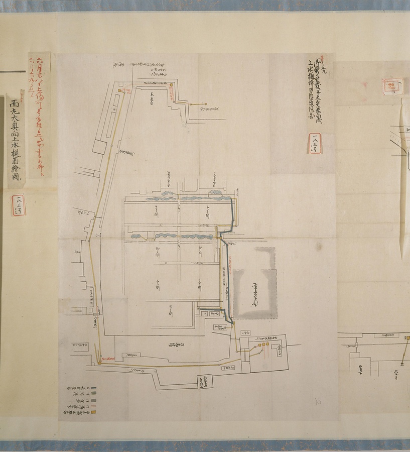 江戸城の本丸、西丸、吹上御殿の上下水樋(とい)の修復に際して作成された。図中には上水樋、上水井戸、泉水などが描かれ、樋の種類は色分けして記入されている。注記内容より、下水樋の修復に際しては、仮の竹樋の設置を検討していたことなどが知られる。(高橋裕次氏執筆)