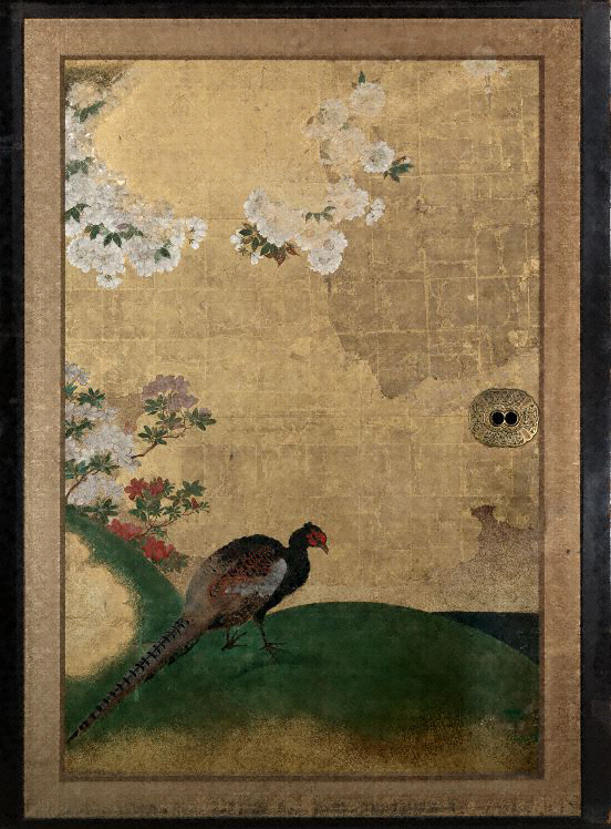 帳台構貼付に描かれる八重桜は、中央に大きく伸び、長押上の小壁まで達している。木の根元には躑躅と一羽の雉子を配し、その向こうには遠山が見える。右側にはたんぽぽや董が咲き、華やかな春の情景が広がっている。図様が長押上貼付や違棚背後の貼付まで連続しているのは、黒書院では例外的な手法であるが、長押や帳台構の縁によって分断されているために、大広間等のような連続する緊密な大画面というよりも、近景から遠景へと移行する春の山野の情景としての印象を強く受ける。