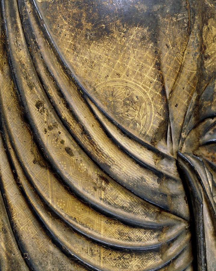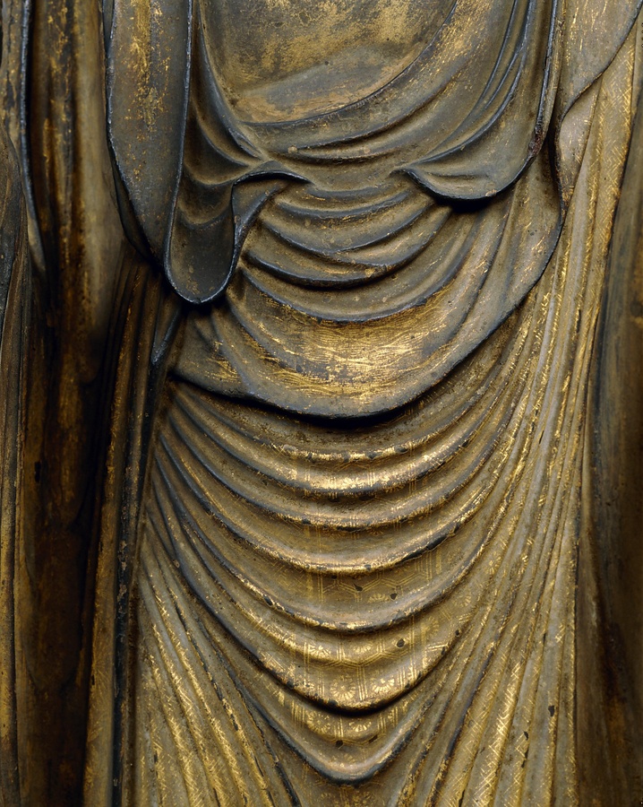 両手に来迎+らいごう+印を結び、前傾しながら左脚を前へ出して歩み寄る姿は、臨終者を迎えにくる様子をあらわす。鎌倉時代にはこうした三尺ほどの大きさの阿弥陀立像が数多く制作された。衣には金箔を細く切って文様を描く截金+きりかね+がよく残っており、美しくも厳かな雰囲気を醸している。