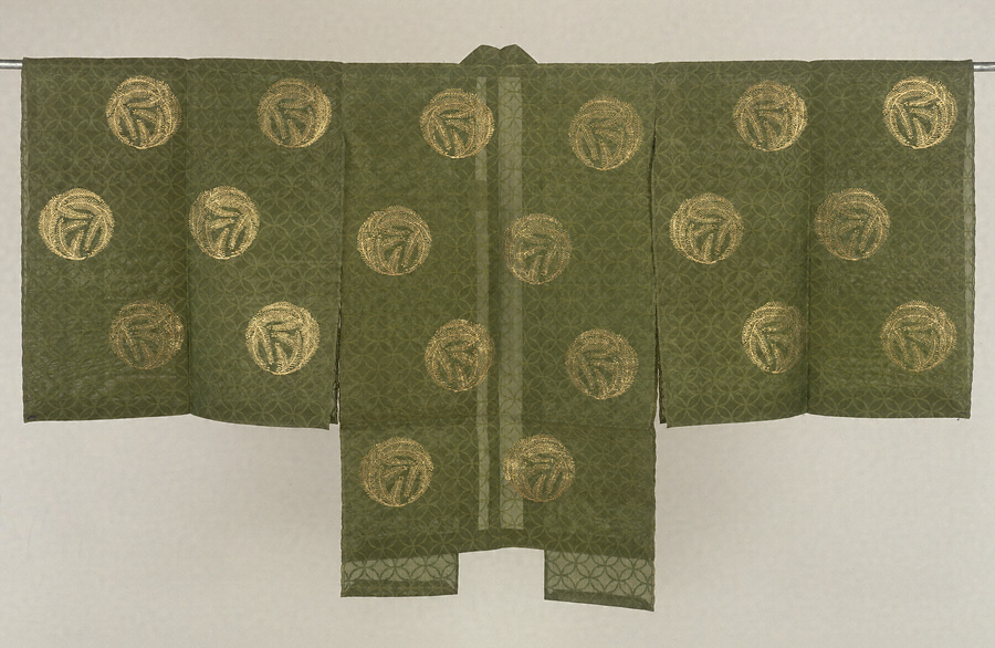 日本では、古来より宮廷の風習で、正月には根付きの松を引くと良いとされた。吉祥模様の1つである松のなかでも根付きの若松は、永遠の若々しさの象徴として好まれたのであろう。顕紋紗(けんもんしゃ)で織り出された地紋の七宝文(しっぽうもん)も吉祥模様の1つである。(20130102_h09)