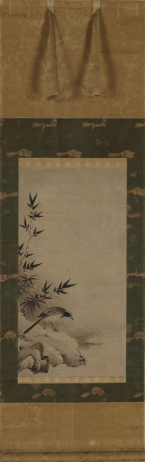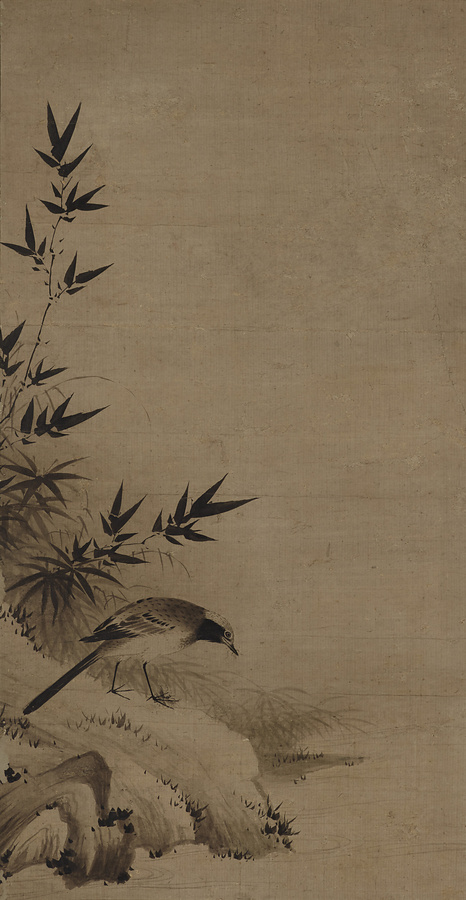 水辺で鳥がくちばしと足で小さな羽虫をとらえている。本図は落款印章を欠き、筆者は不詳であるが、岩と点苔の描写は阿弥派に類似し、作者と阿弥派との関係を推測させる。紙の地色と諸所に施された濃墨の対比も美しい。