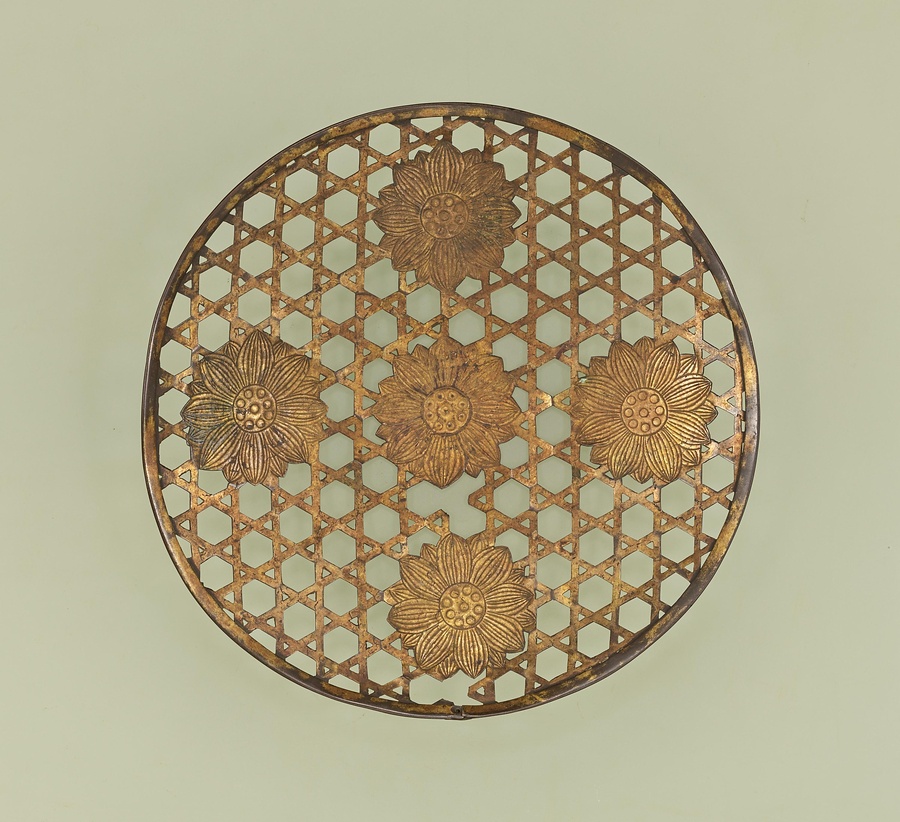 華籠は法会【ほうえ】の際に僧侶【そうりょ】が撒【ま】く、造花の花弁を入れる浅い容器です。正倉院南倉【なんそう】に伝わる華籠のように、竹を編んで作られたものが古く、次第に耐久性を求めて金属などで作られたと考えられます。本品は金銅【こんどう】製で、籠目【かごめ】を透【す】かし彫【ぼ】りで表し、五【ご】の目【め】に蓮華【れんげ】を並べています。