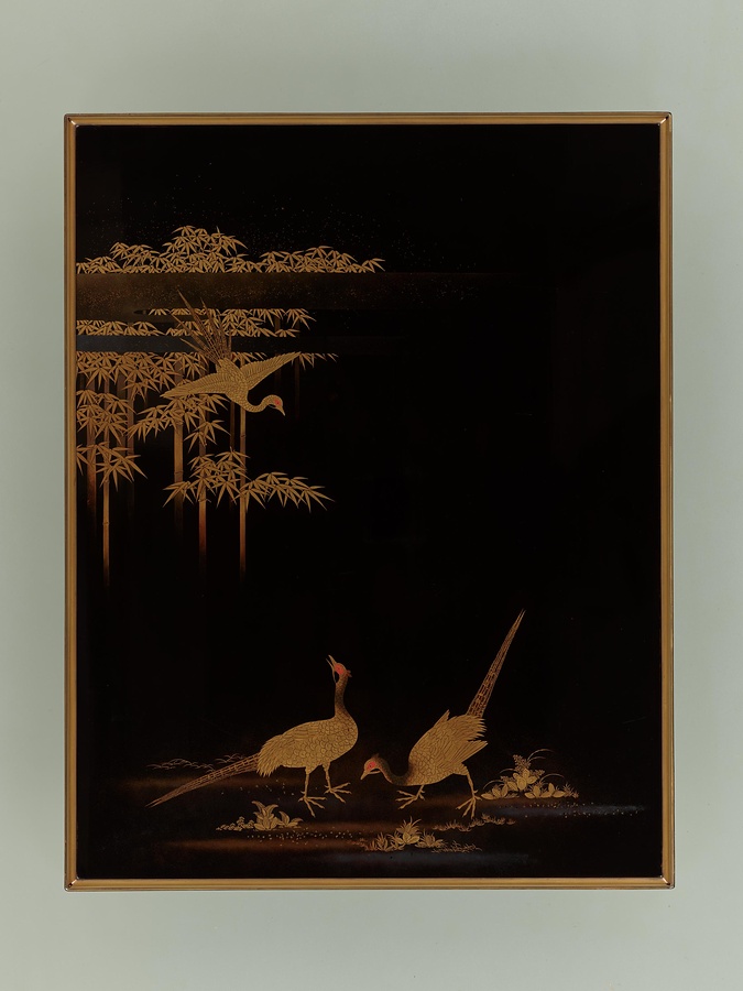 蓋の裏側に銘があり、印籠蒔絵師として有名な塩見政誠【しおみまさなり】の作であることが分かる。箱の外側には研出【とぎだし】蒔絵により、竹林に雉子の図柄が精緻に表わされている。細かく描かれた雉子の羽や竹の葉の表現には、研出蒔絵の名手であったという塩見政誠の技量を看て取ることができる。