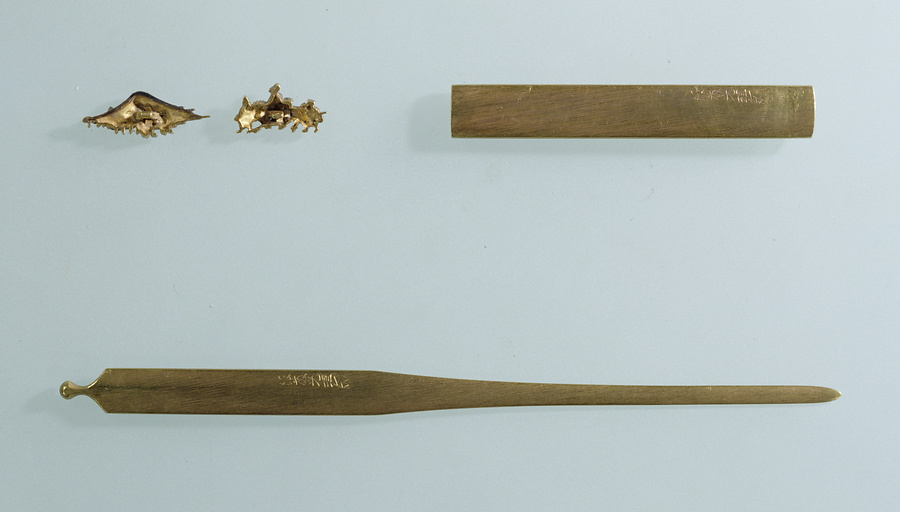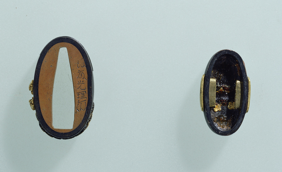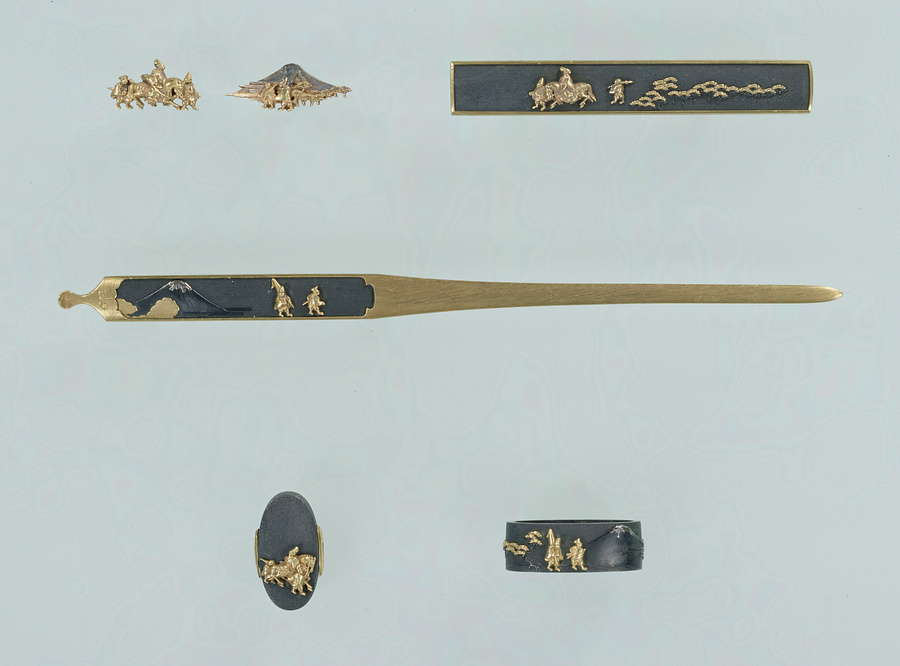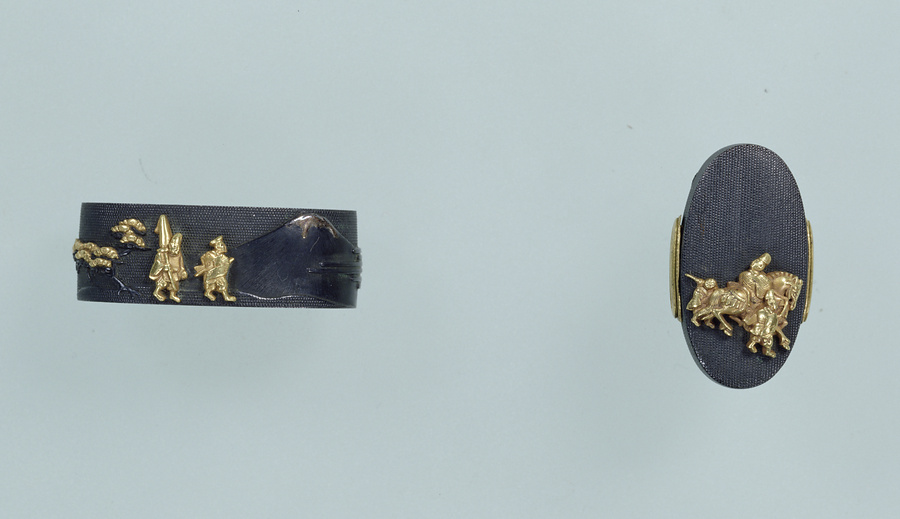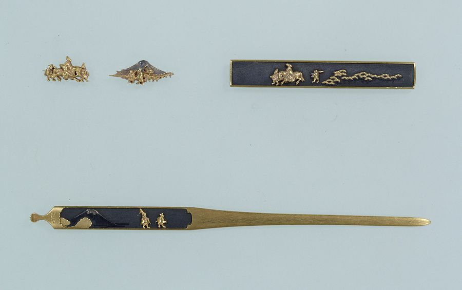 鐔のほかの刀装具として、本来刀身の茎(なかご)と柄(つか)を固定する釘の頭の装飾であった目貫(めぬき)、鞘口の表に指し添える理髪の道具とされた笄(こうがい)、鞘口の裏に指し添える小刀(こがたな)の柄(つか)である小柄、柄の両端の金具である縁頭(ふちがしら)などがあり、揃いの目貫・笄・小柄を三所物(みところもの)と呼んでいる。