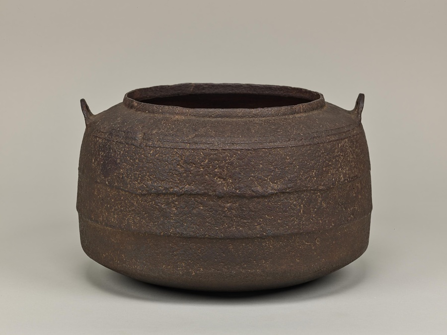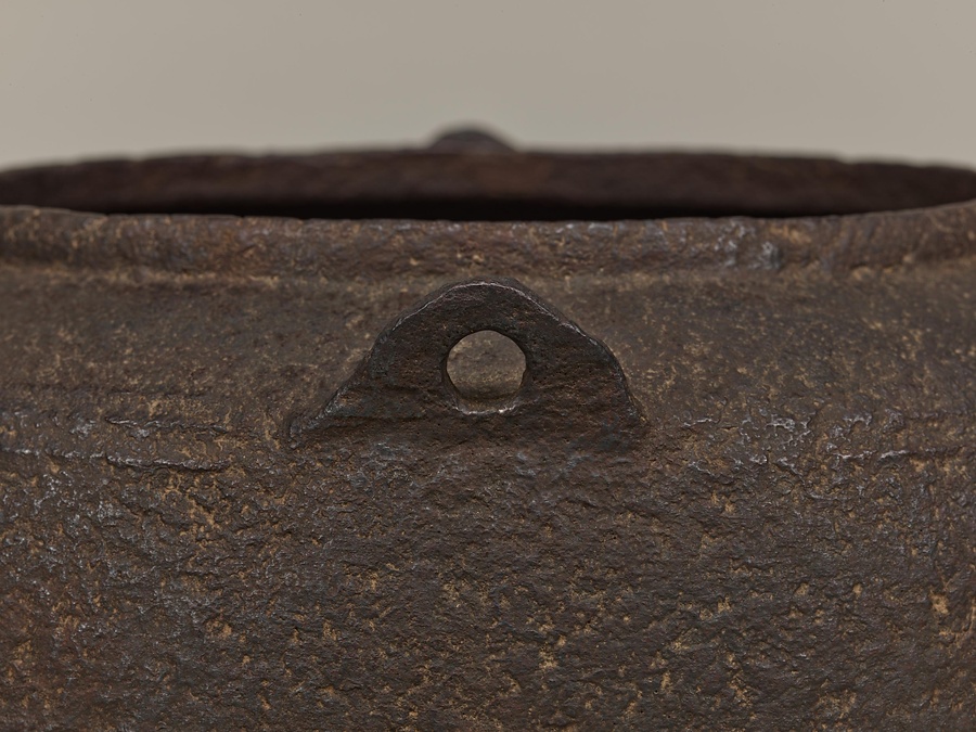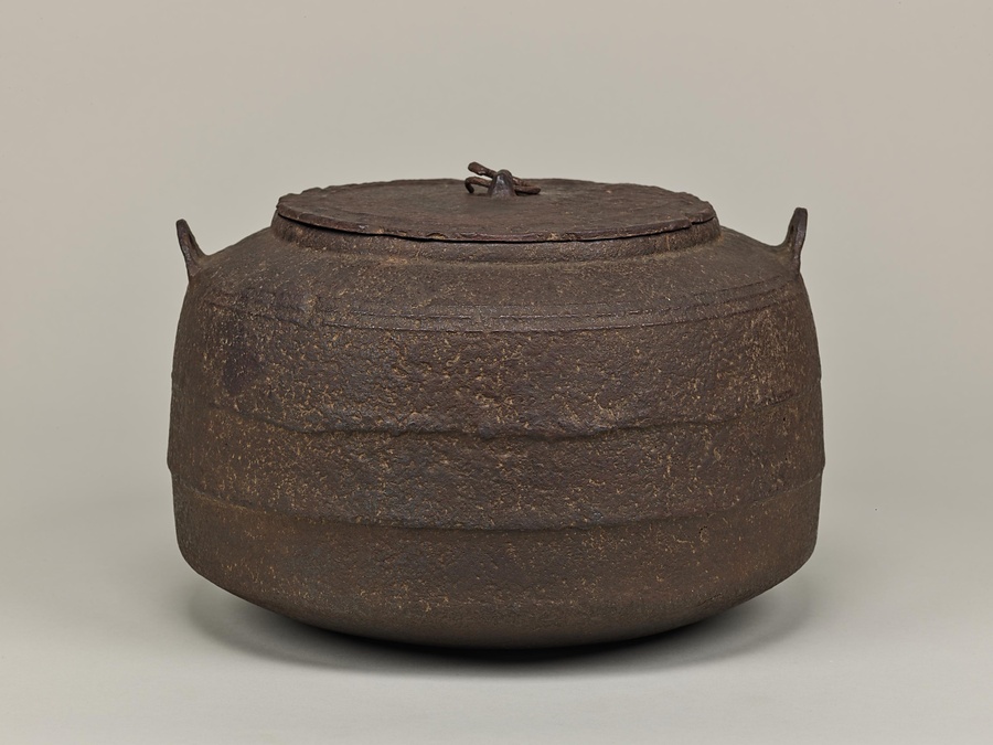 比叡山【ひえいざん】延暦寺【えんりゃくじ】の大講堂の香炉【こうろ】を茶釜に転用したことから、この名で呼ばれます。広口【ひろくち】で、鐶付【かんつき】は常張【じょうはり】、肩に三条の突線【よつせん】をめぐらしています。胴に一条の紐【ひも】をめぐらして上下二区に分け、上区に「大講堂」の文字を陽鋳【ようちゅう】しています。作者と伝える宮崎寒雉【みやざきかんち】は加賀前田家の御用釜師です。