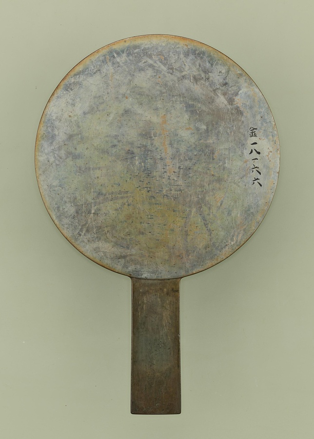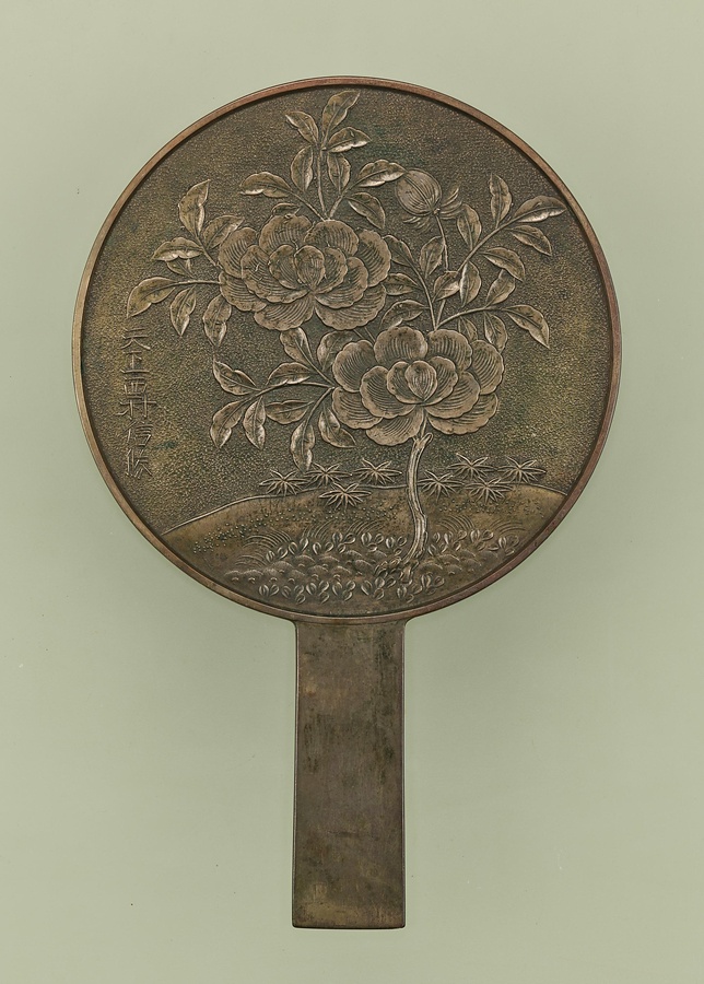 近世以降に普及する柄付きの鏡で、鏡背【きょうはい】面(顔を写す面の裏側)には砂目地【すなめじ】に、力強い篦【へら】押しによって、大輪の花を咲かせた株立ちの牡丹を表しています。柄が次第に太く短くなっていくのが柄鏡の特色であることから、本品は江戸時代後期に製作されたと考えられます。