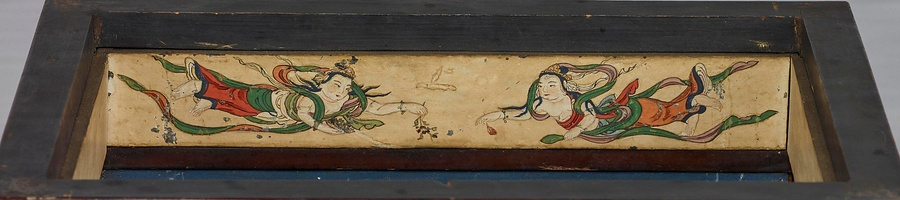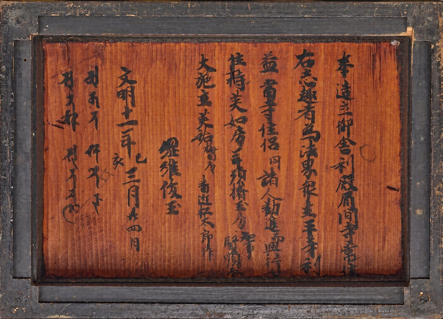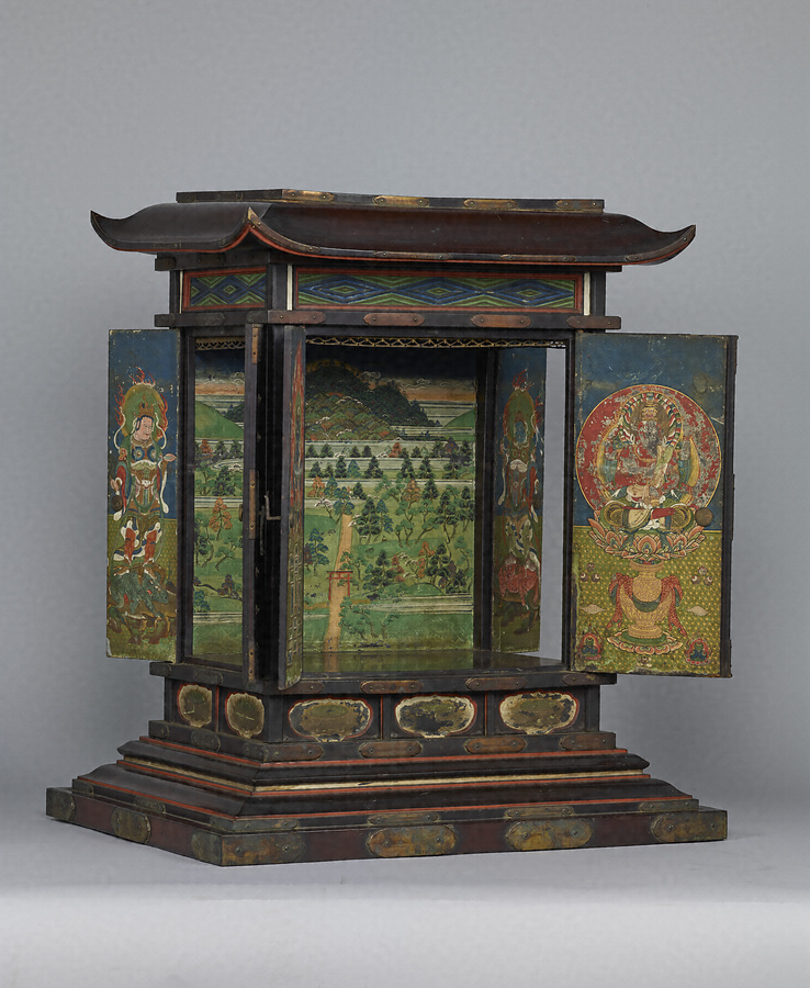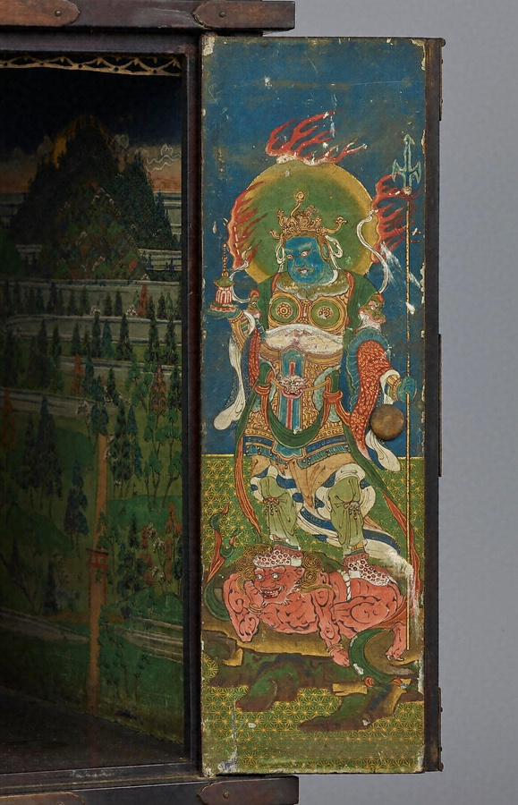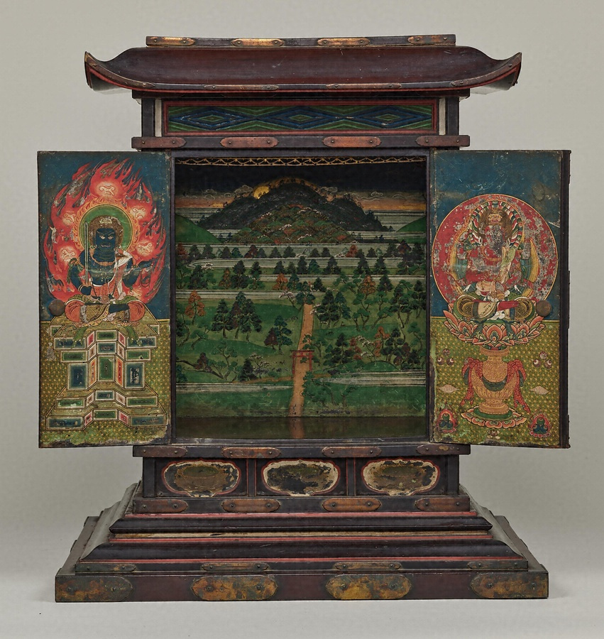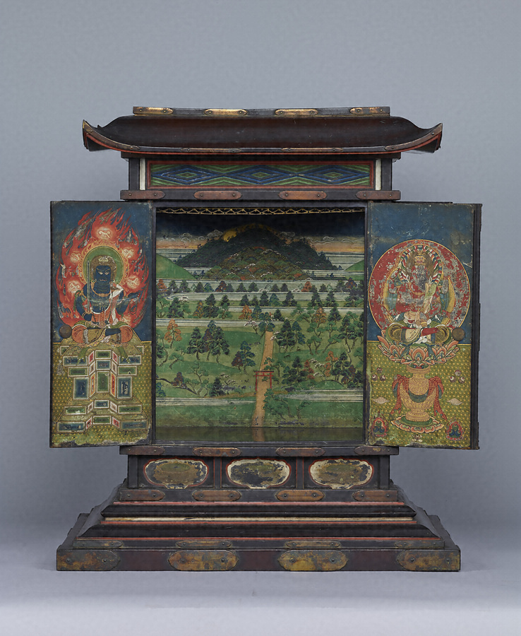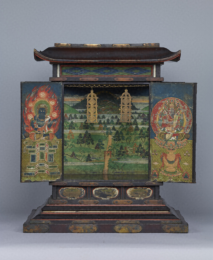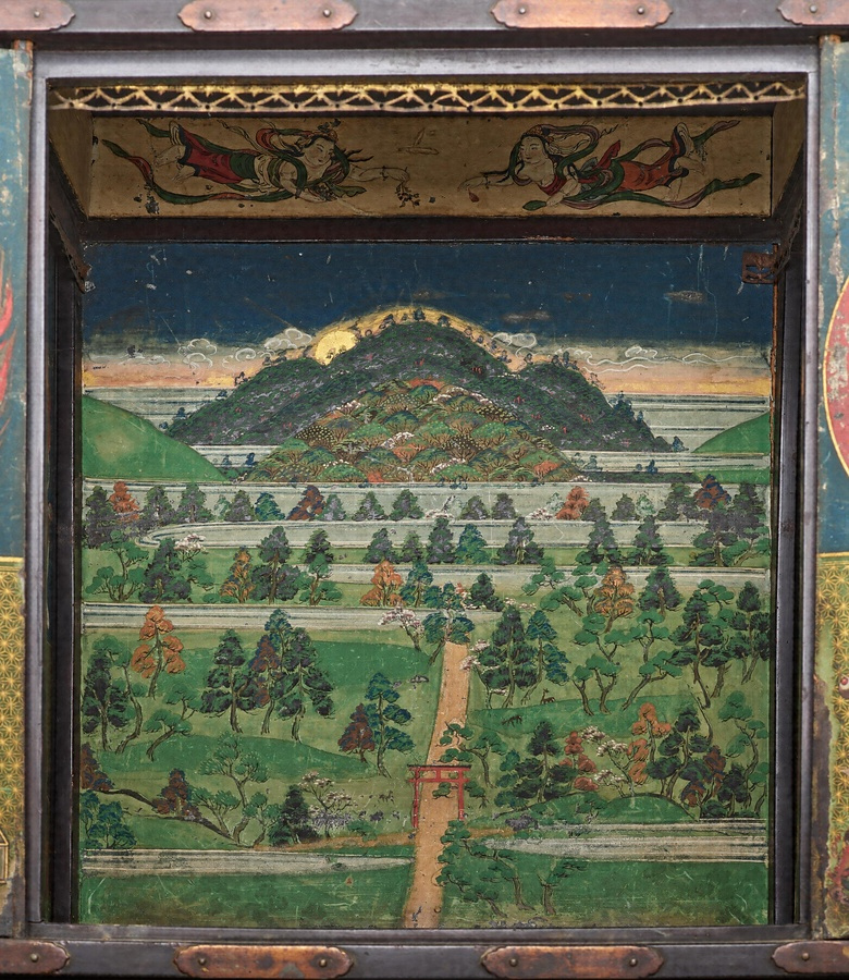 舎利*しゃり*(釈迦の遺骨)を納める厨子で、奧壁に春日野の景観を描く。正面の扉には右に愛染明王*あいぜんみょうおう*、左に不動明王*ふどうみょうおう*を、側面の扉には四天王を配し、春日の神々と諸仏が舎利を守護していることを示す。社殿を描かず、自然景観のみによって春日野を表わすのは特徴的。