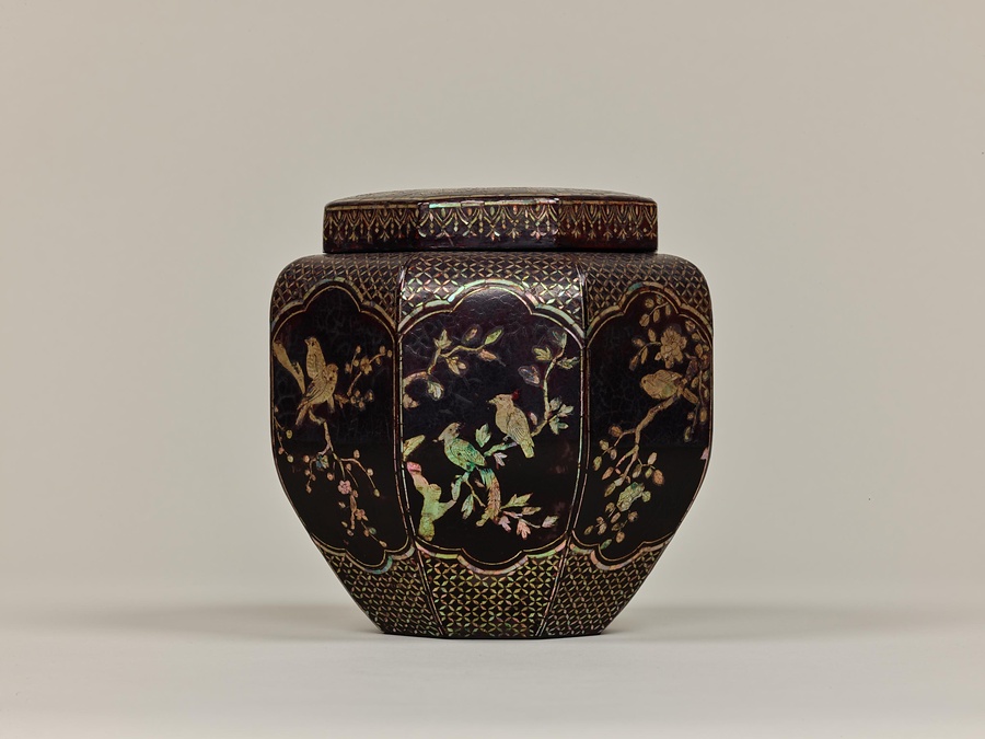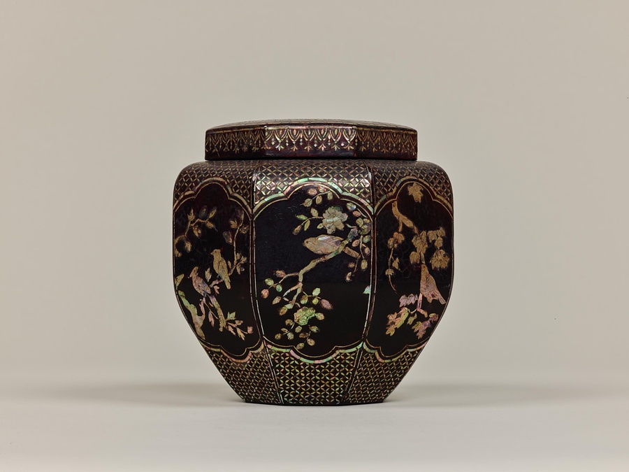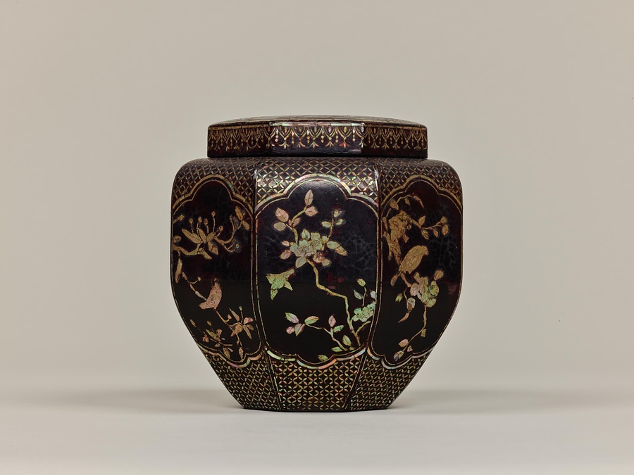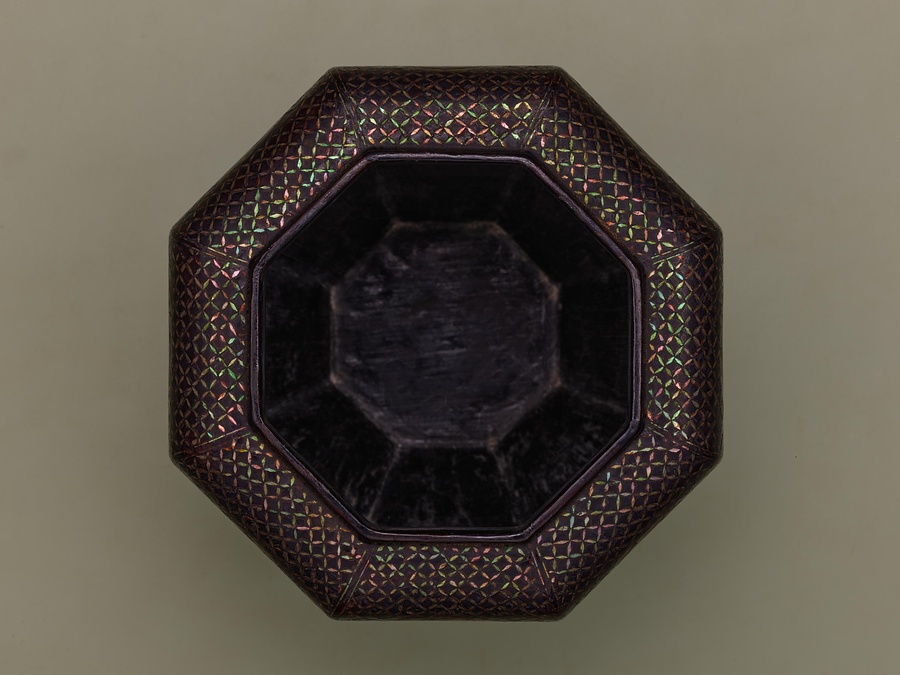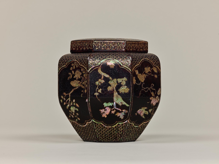 木製黒漆塗りで被蓋(かぶせぶた)造りの八角壺である。明時代後期の螺鈿(らでん)技法の影響を受けて作られた琉球漆器の好例で、壺の形をなす例は珍しく貴重。文様は蓋上に楼閣(ろうかく)・樹木・橋などともに人物を描き、身側面の窓枠内には梅に鶯(うぐいす)、桜に小鳥などの花鳥を描き、枠外を七宝繋文(しっぽうつなぎもん)で埋める。