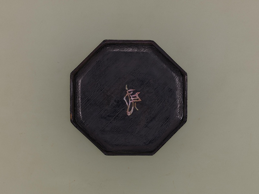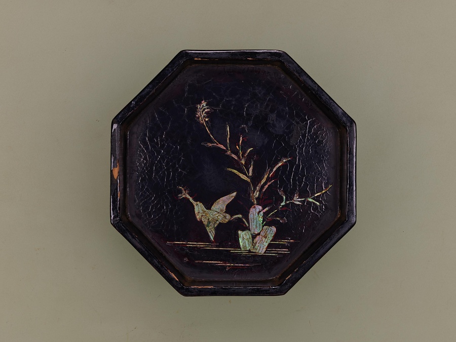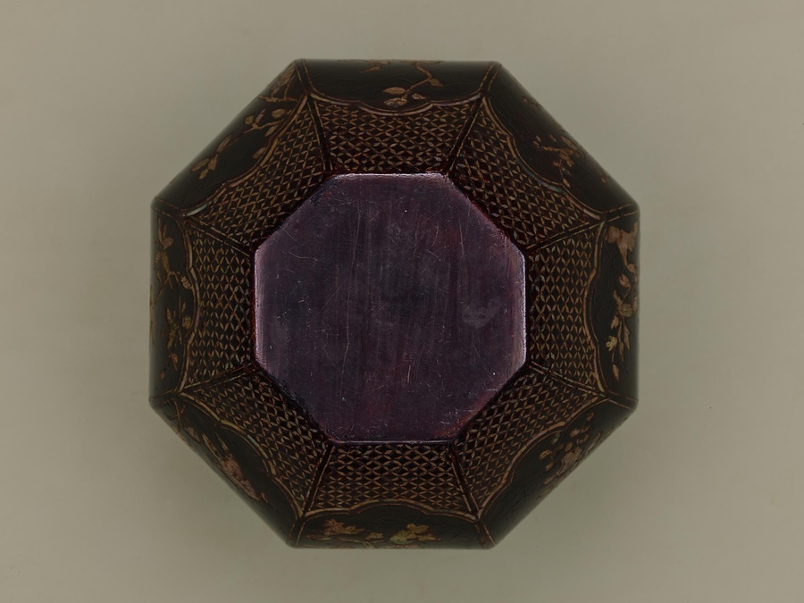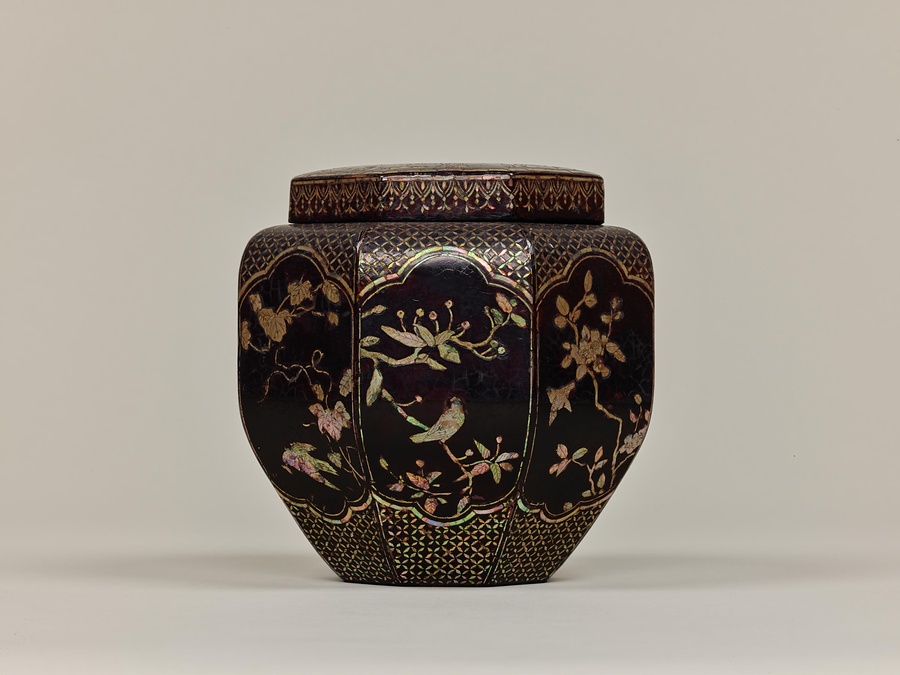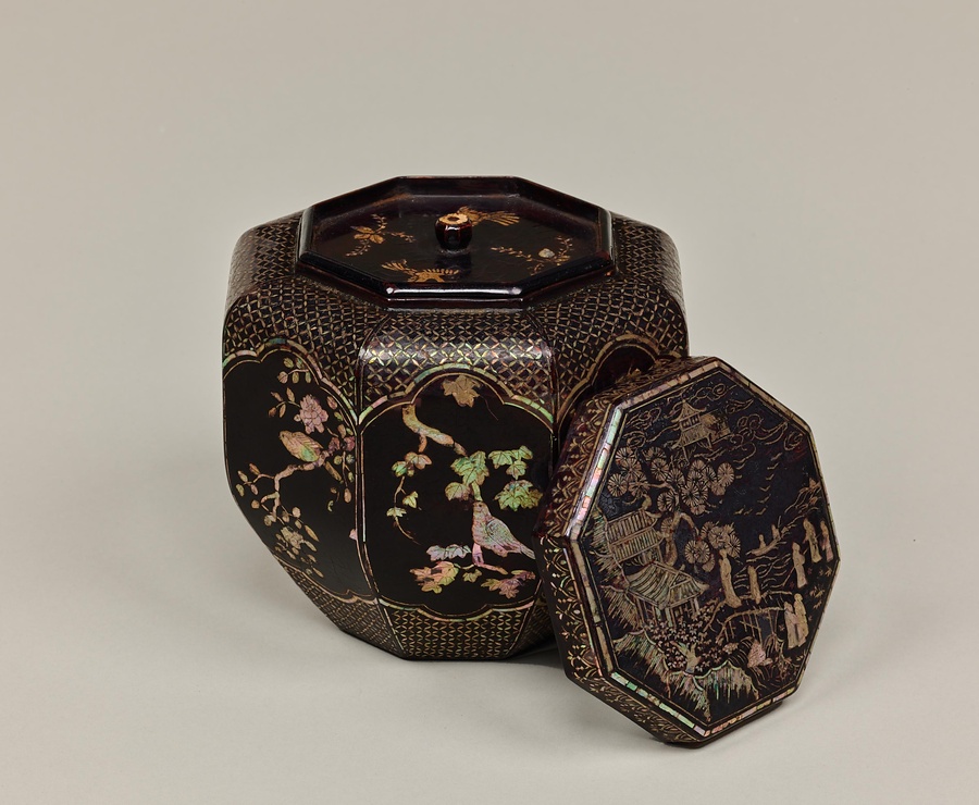 木製黒漆塗りで被蓋(かぶせぶた)造りの八角壺である。明時代後期の螺鈿(らでん)技法の影響を受けて作られた琉球漆器の好例で、壺の形をなす例は珍しく貴重。文様は蓋上に楼閣(ろうかく)・樹木・橋などともに人物を描き、身側面の窓枠内には梅に鶯(うぐいす)、桜に小鳥などの花鳥を描き、枠外を七宝繋文(しっぽうつなぎもん)で埋める。