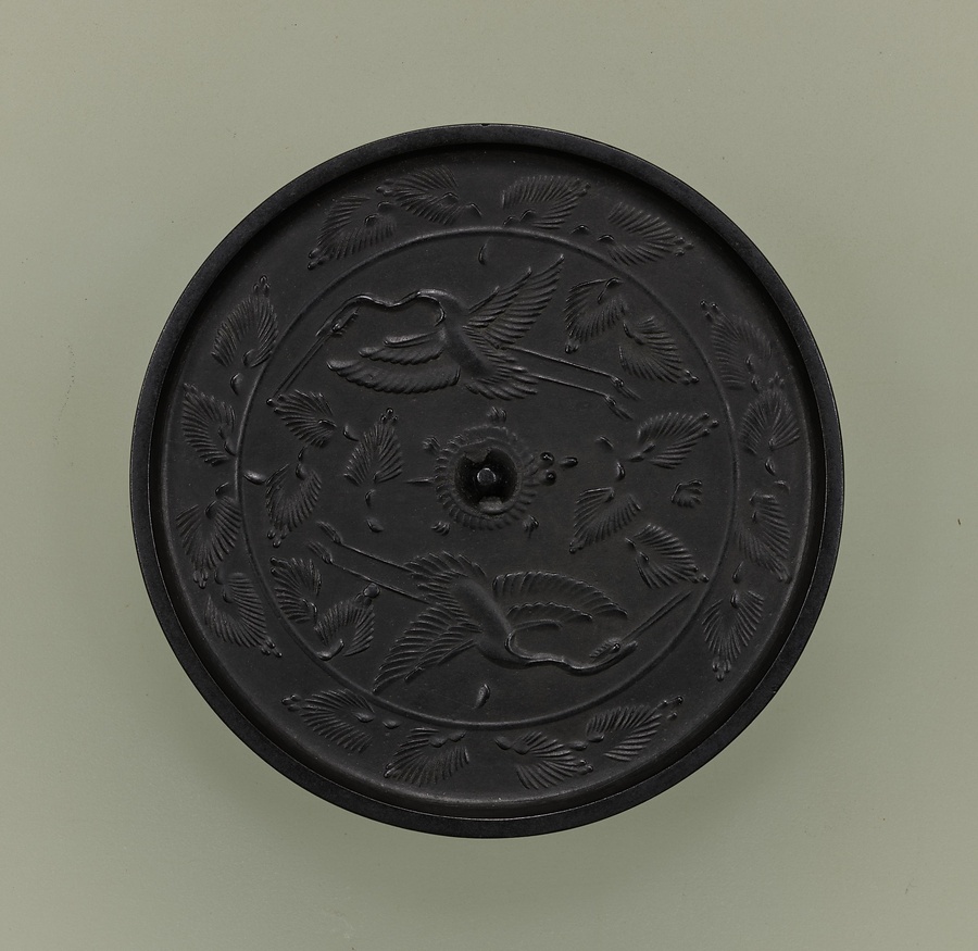 鈕【ちゅう】を挟んで一対【いっつい】の鶴が旋回【せんかい】する典型的な構図の松鶴鏡【まつつるきょう】です。界圏【かいけん】の内側に鶴が収められており、松枝もなるべく界圏を避けるように配置されているようでやや窮屈な印象を受けます。繁縟【はんじょく】な羽や松葉の表現、立体性のある文様【もんよう】の鋳出【いだ】しは、新しい時代への志向と考えられます。