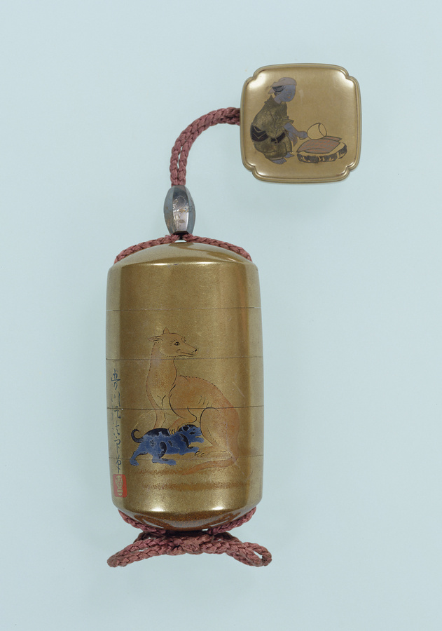 印籠は薬を入れて腰に提げる小さな容器。江戸時代中頃以降は実用品というより、装身具(アクセサリー)として用いられることが多かった。この印籠は表面に犬の親子を研出蒔絵で描いている。狩野養川院の下絵で、江戸時代後期の代表的印籠蒔絵師・古満寛哉の作。