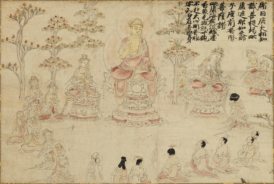 仏さまの教えを説いたお経の一つ、華厳経(けごんきょう)は奈良・東大寺では大切なよりどころとされています。これは、その中で説かれる内容の一つを絵巻にしたものの一部です。もともとの絵巻は東大寺に伝わりましたが、いくつかの場面が切りはなされた断簡となり、掛軸に仕立て直されました。