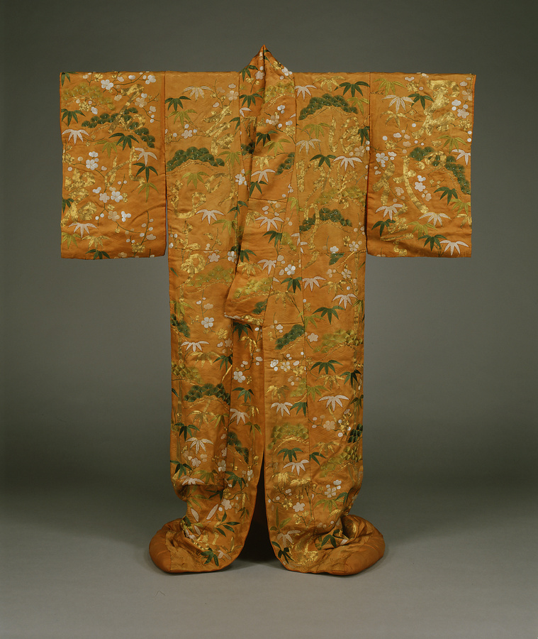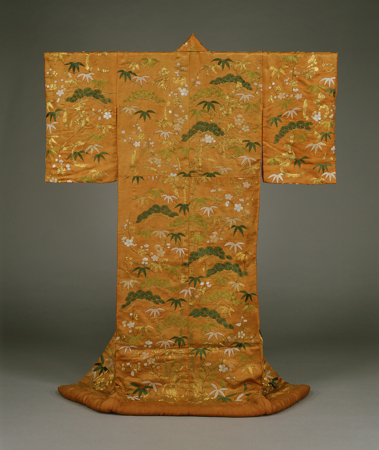 絹綾を華やかな紅色に染め、刺繡と切付で模様をあらわした総模様の打掛。金糸の駒繡であらわされた黄金の岩から松竹梅が咲き乱れる1本の樹を立ち上げるデザインは、典型的な武家の婚礼衣装のデザイン様式です。現状では振袖が短く仕立て変えられています。