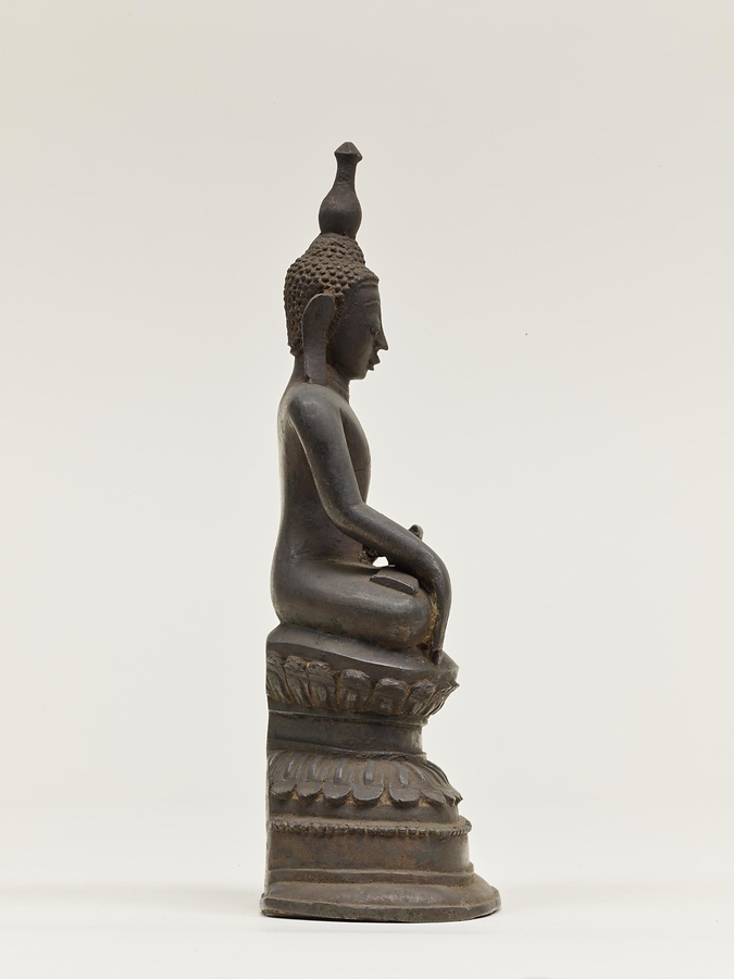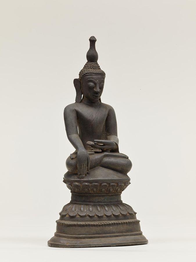 ビルマ最後の王朝コンバウン朝の仏像様式のひとつ、アヴァ様式の仏像です。結跏趺坐、触地印はパガン時代から好まれる定型ですが、アヴァ様式の仏像の特徴は四指の長さを揃え、頭上のラッサミーが蓮蕾形から水瓶状に変化し巨大化する点です。