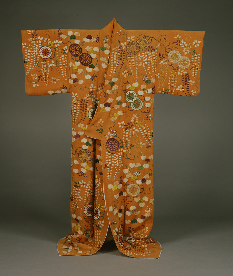 絹の単仕立の夏の着物を単衣と称する。絹縮は縦に皺(しぼ)を細かく出した縮緬(ちりめん)の一種で、汗ばむ季節でも肌触りがいいことから夏の衣料に好まれた。葵と藤を白上げや鹿の子絞り、刺繍(ししゅう)で総模様に表し、源氏車を間に配したデザインは武家女性が着用する小袖の典型。