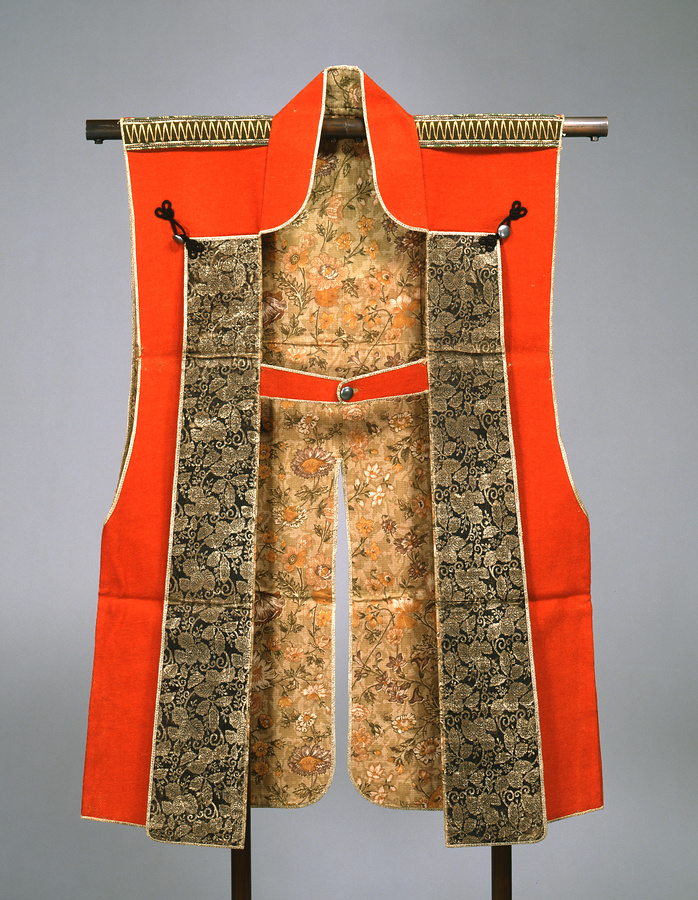 ヨーロッパから舶載された赤い毛織物は酒好きの妖精「猩々」のように赤いと、戦国時代から武将に好まれました。白い羅紗を切付@きりつけ@(アップリケ)にして背中央の家紋を表わします。裏地には、1820年代頃より輸入されるようになったヨーロッパ更紗@さらさ@が用いられています。